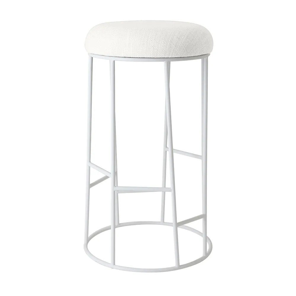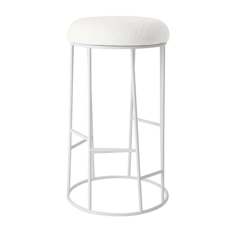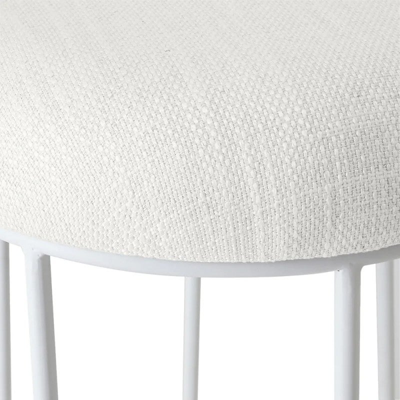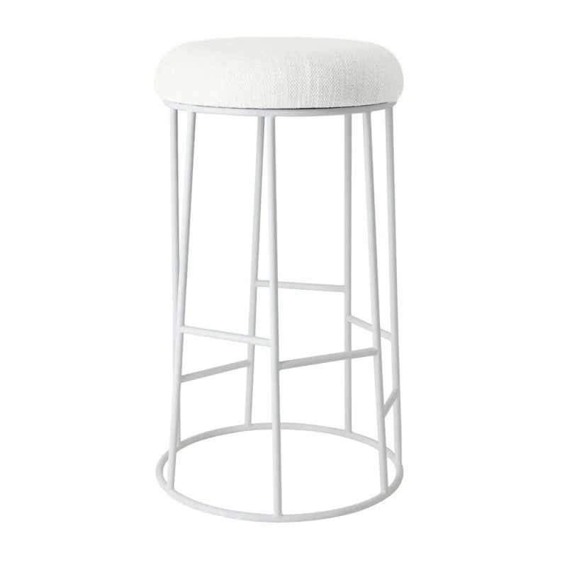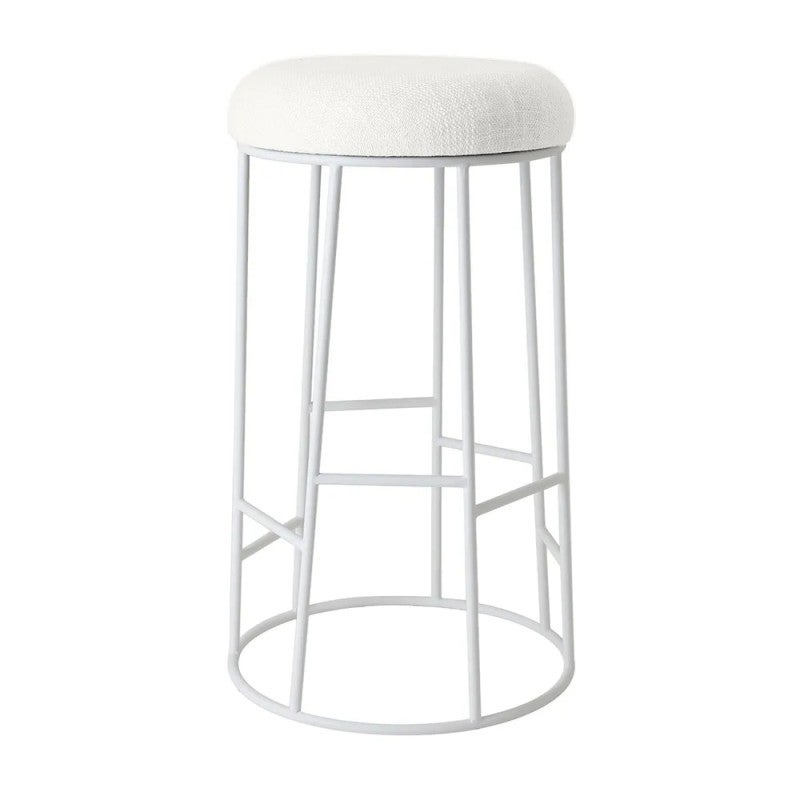 Transform your modern bar or kitchen with the Aiden White Steel Bar Stool in Natural Linen, a sleek addition from the Aiden range. Standing 76cm high, its cushioned round seat in natural linen blend sits atop a powder-coated white steel frame with a circular base and integrated footrest for support and balance, supporting up to 150kg with no assembly required. This Aiden white steel bar stool blends clean lines with everyday functionality, perfect for minimalist contemporary interiors.