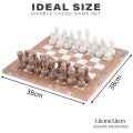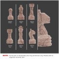 - Board: 38cm W x 38cm D; King: 8.9cm H; Queen: 7.6cm H; Bishop: 7cm H; Knight: 7cm H; Rook: 7cm H; Pawn: 5.7cm H
