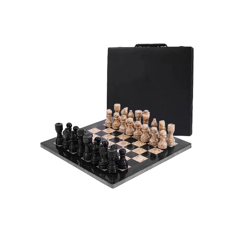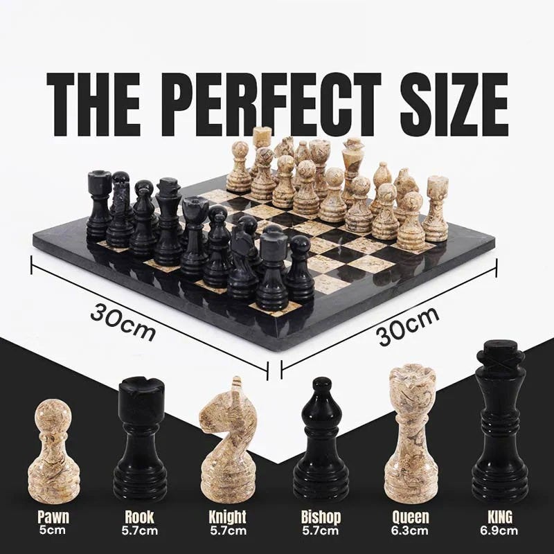 - Board: 30cm W x 30cm D; King: 6.9cm H; Queen: 6.3cm H; Bishop: 5.7cm H; Knight: 5.7cm H; Rook: 5.7cm H; Pawn: 5cm H
