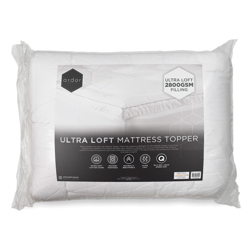 Ardor presents the Ultra Loft Mattress Topper. Featuring a generous 2800gsm fill, this mattress topper is on of the highest lofts available in our market. Revitalise your mattress by adding this luxuriously thick layer that works to support the natural contours of your body while adding extra comfort. The easy-fit jersey skirt encases your mattress to ensure a snug fit. - Brand