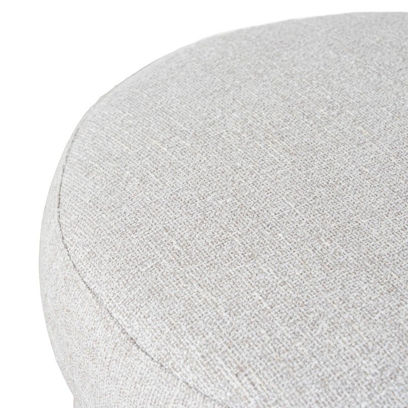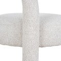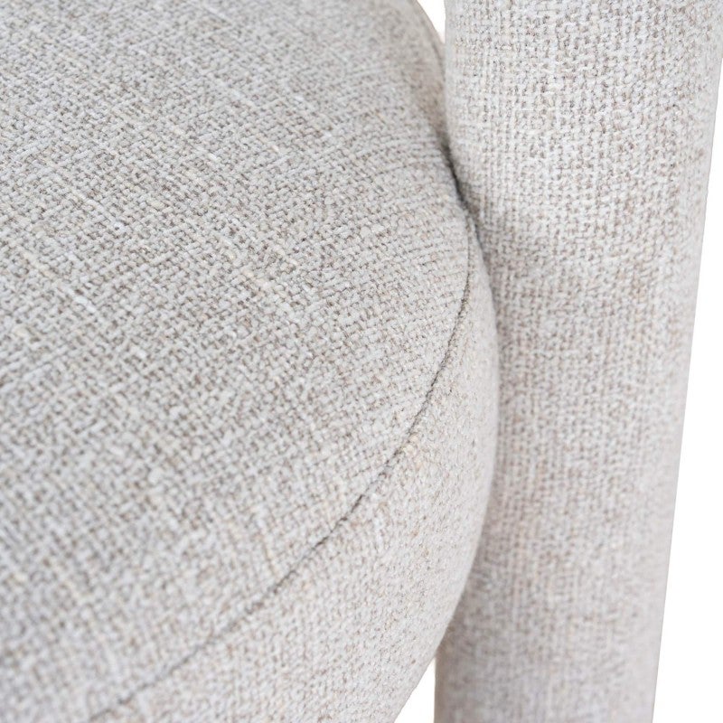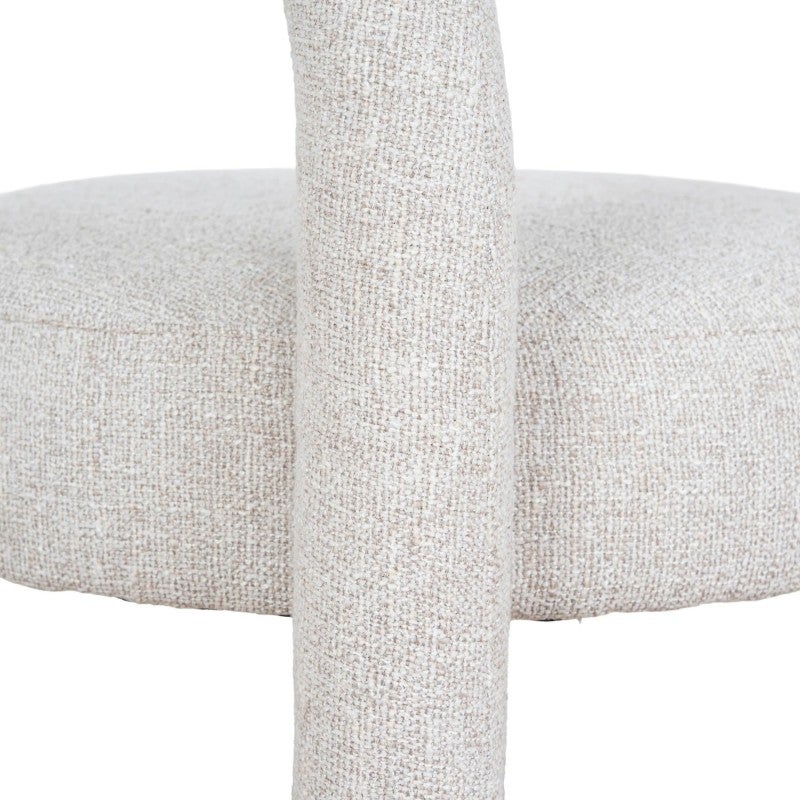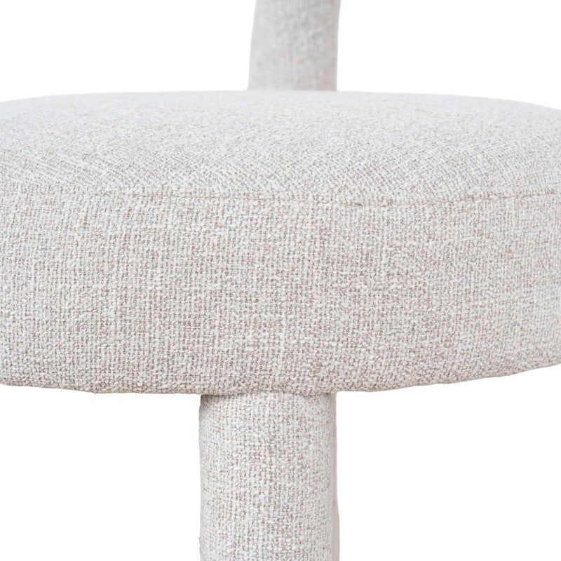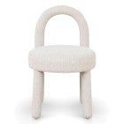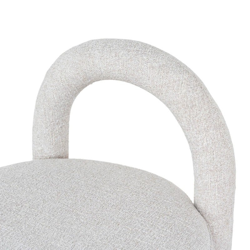 - Sculptural arched backrest paired with a round seat