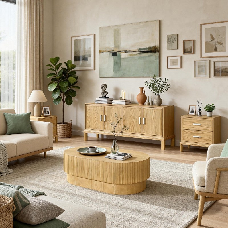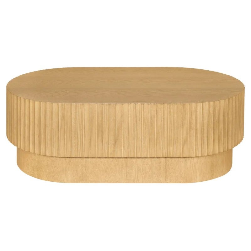 The Avery Oval Coffee Table in Natural Oak brings sculptural warmth and texture to living spaces. Featuring a fluted timber base and smooth oval top, this statement piece highlights the beauty of natural oak grain. Its generous surface area and refined silhouette make it ideal for anchoring lounges with a soft, organic aesthetic.