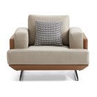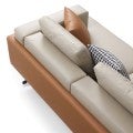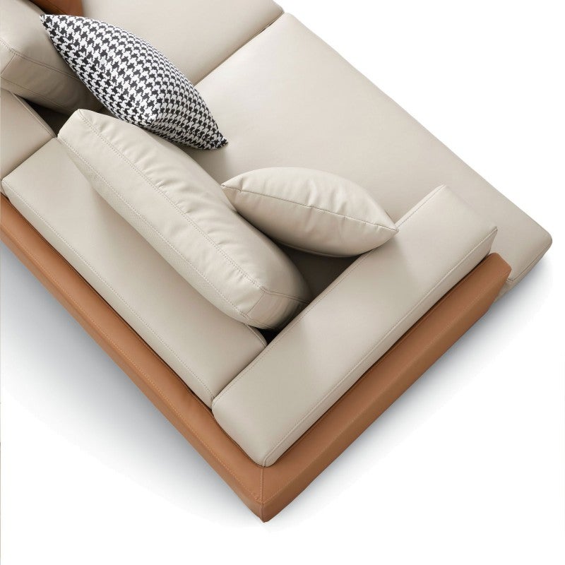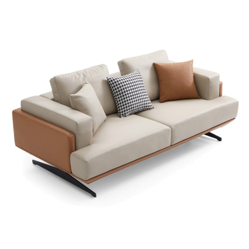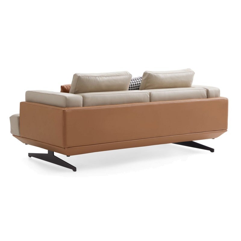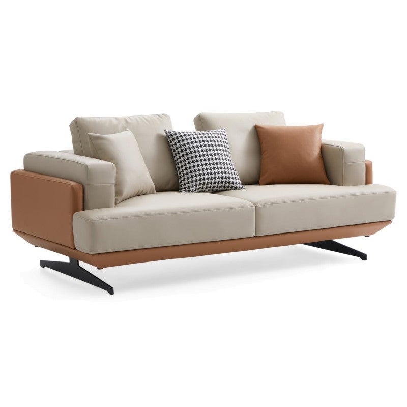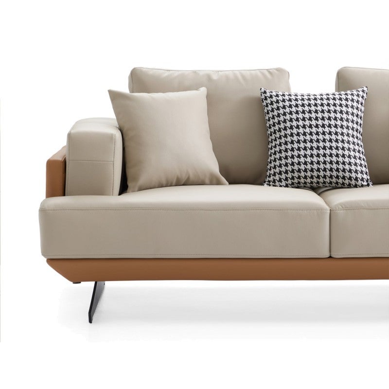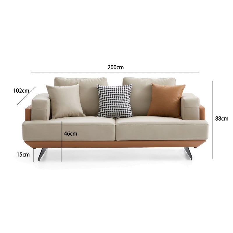 - Bonded Leather (Beige Part), Faux Leather (Caramel Part), Feather, High Density Foam, Timber Frame, Stainless Steel Legs
