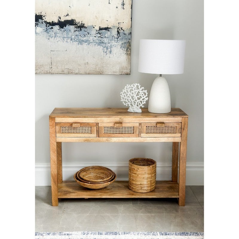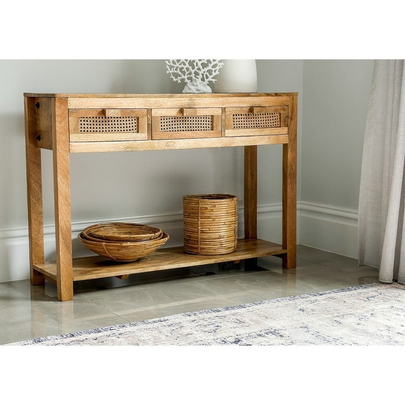 Fab Habitat's rattan solid wood console table will add style and luxury to your home. Designed in stunning natural finishes for timeless and elegant charm for your living space. Table top has ample space to conveniently hold photo frames, decorative pieces, and vases. Table top is made of mango wood for organic strength and style. Natural look of mango wood offers a varied grain for an interesting and textured finish. Weight capacity: 60 kg. Minimal assembly required, instructions provided. Please follow the care instructions provided with the product. Due to the nature of the materials, the grain and colour may vary to maintain natural aesthetic. Colour may also vary due to screen/monitor settings.