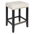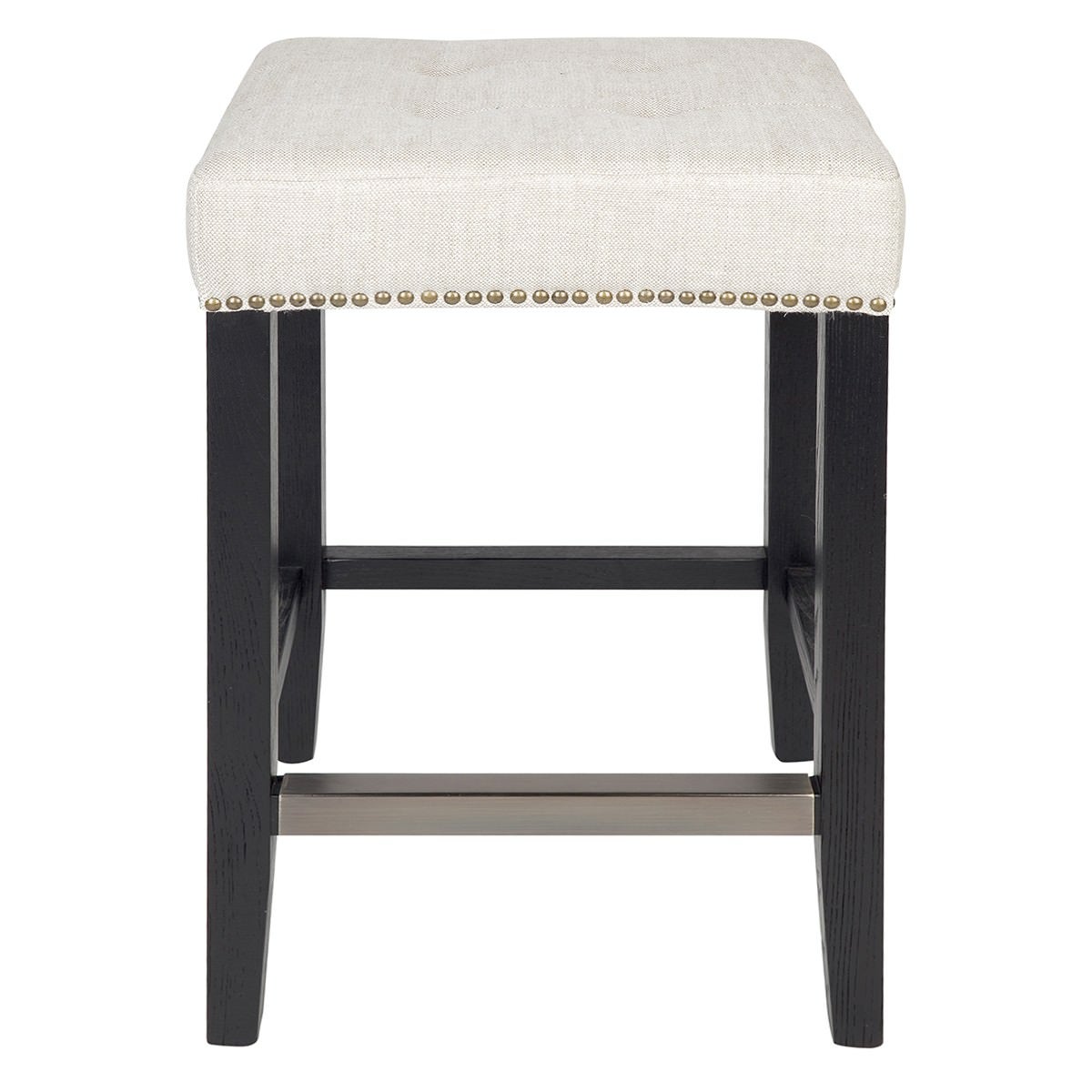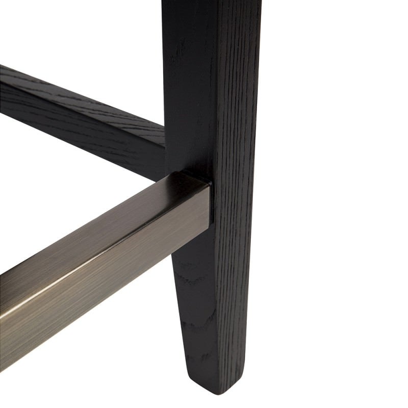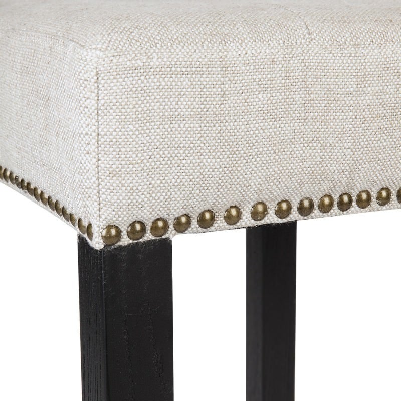 Natural linen upholstered cushioned top kitchen stool with square black painted beech frame and legs. With detailed brushed bronzed studs with a brass finished foot rest. Care Instructions: Professional Dry Cleaning Services Recommended.