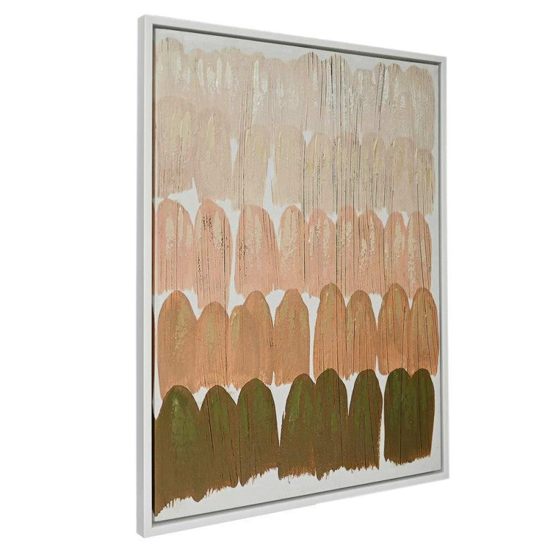 Elevate your space with our exquisite canvas painting, featuring rows of gracefully arched strokes in soothing neutral tones. Each palette evokes a sense of harmony and sophistication, enhancing any room with its understated elegance. Encased within a pristine white shadow box frame, this artwork exudes timeless beauty and modern allure. Cotton canvas hand-stretched across frame; D-Ring and String Hanging Method.