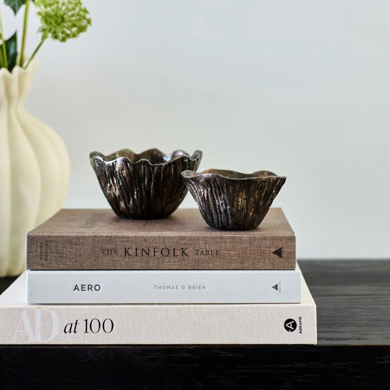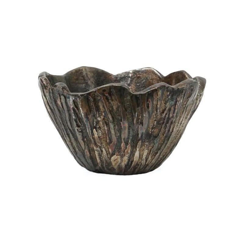 Style Enhance your space with the distinctive charm of this ornamental bowl- featuring a scalloped- waved edge that adds an elegant- organic touch. The bowl's oxidative burnished finish gives it a unique- antiqued look- with rich tones and subtle depth that catch the eye. Available in two sizes- these bowls are perfect for styling as a decorative accent on side tables- shelves- or countertops. Ideal for holding trinkets- jewellery- or simply admired as a standalone piece- styled around the home. Wipe with a clean dry cloth.