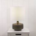 The FAWN ceramic table lamp comes complete with a fabric drum shade. This designer lamp is perfect for a living room or hallway table in a mid-century styled home. The on/off switch is located on the cord.