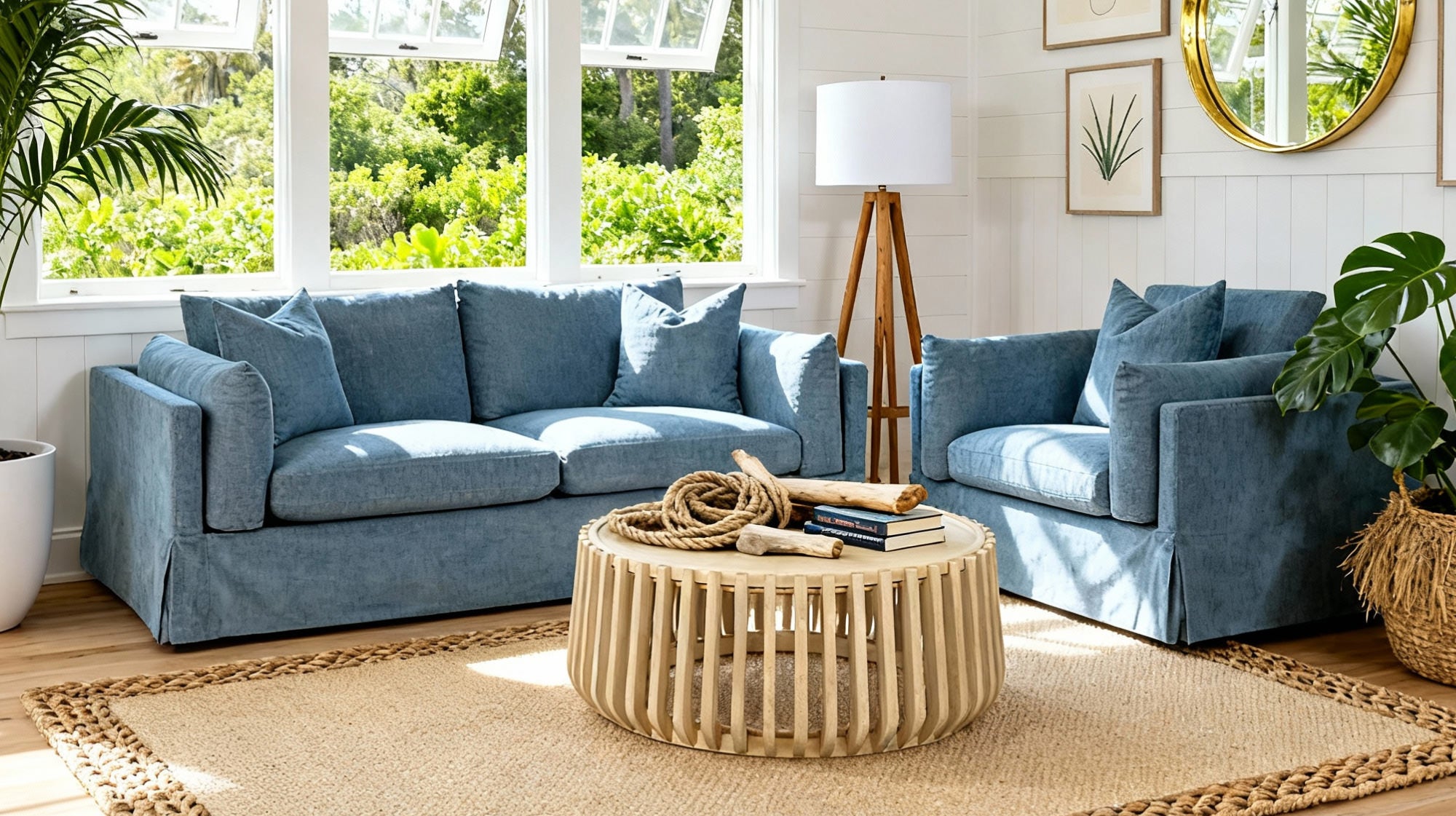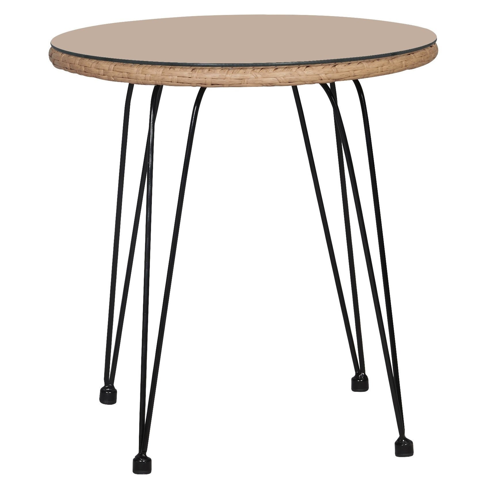 - Top: Glass, Synthetic Wicker; Leg: Steel