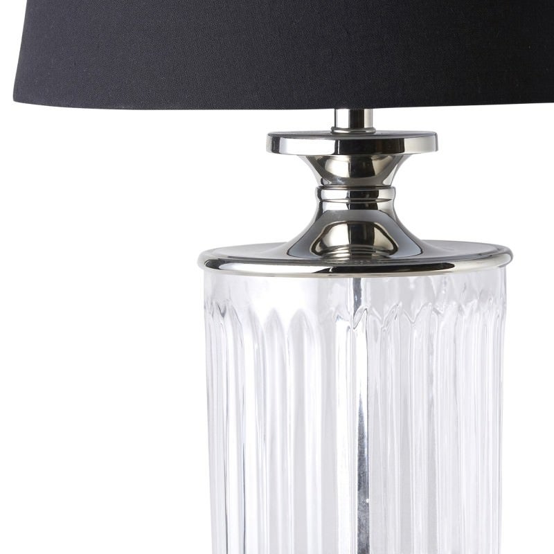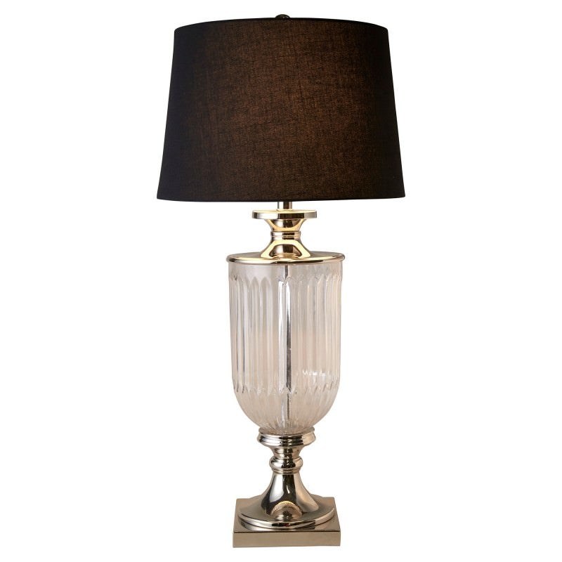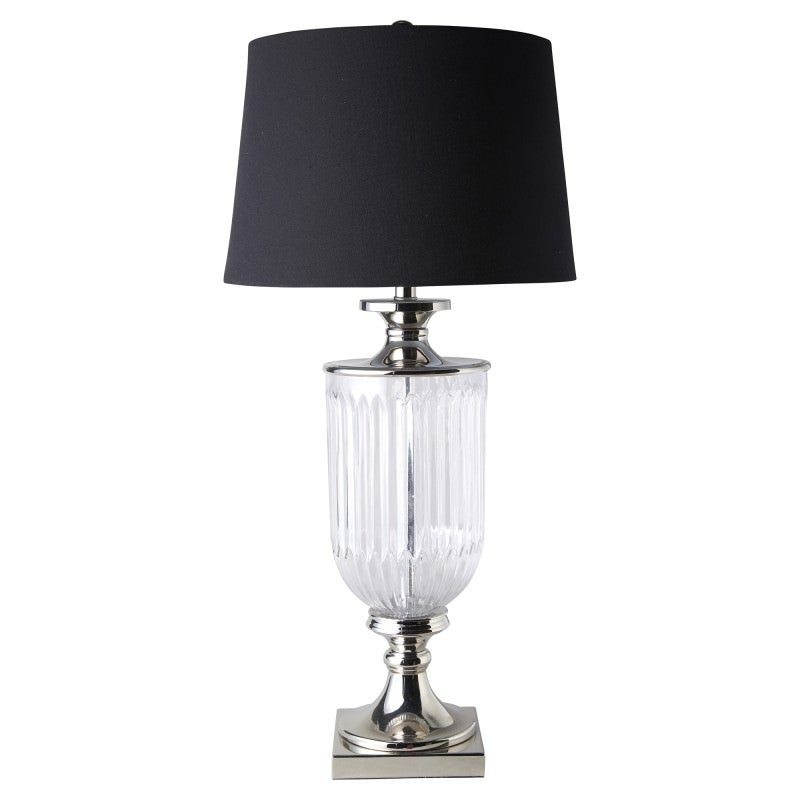 A elegant lamp and the right atmospheric lighting has the power to totally transform a space. This regal design is comprised of a trophy-shaped base made from glass and iron, completed with a natural linen drum shade. For perfect symmetry, style in a pair.