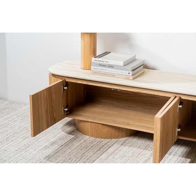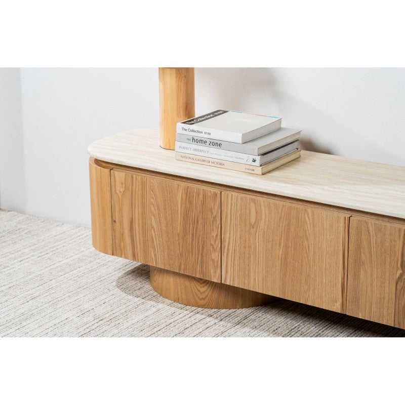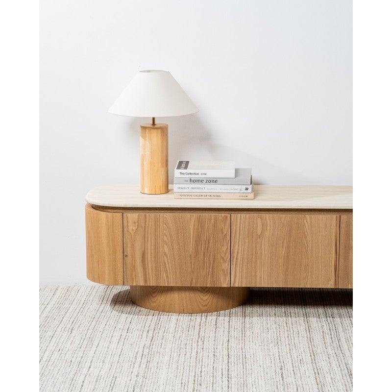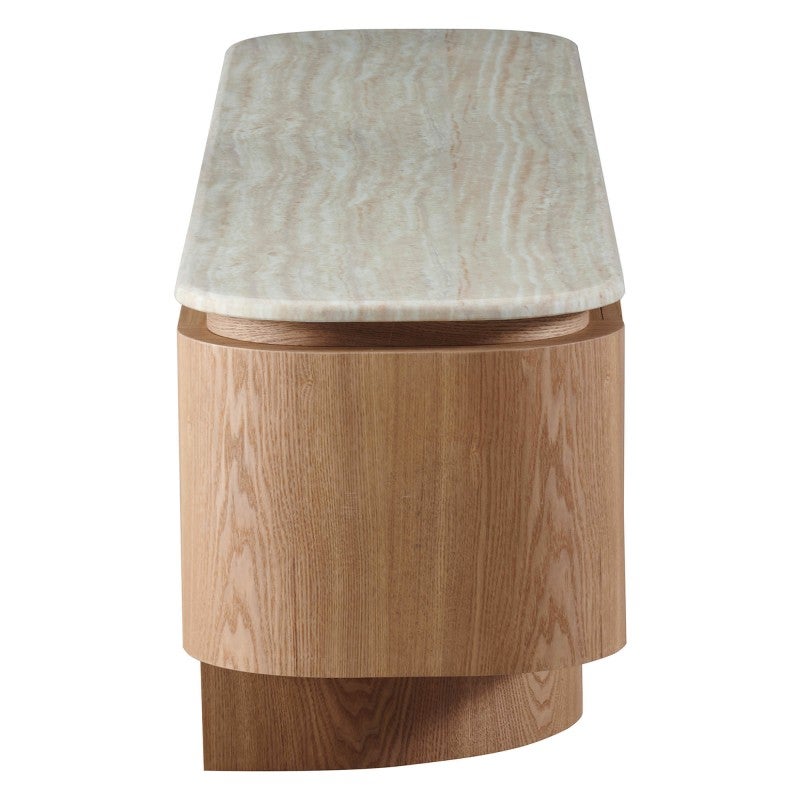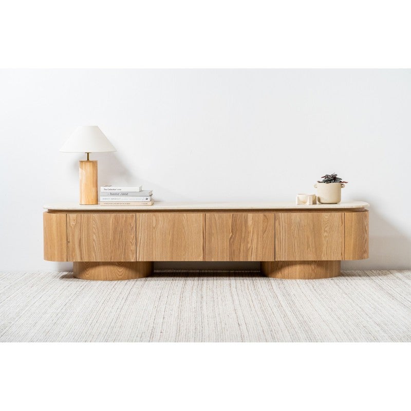 The Haverin range blends organic textures with modern design, creating a collection that feels both timeless and contemporary. Each piece is topped with matte white travertine artificial marble, offering a sophisticated stone look with everyday durability. The body and frame are crafted from ash veneer MDF in a natural finish, adding warmth and elegance. With its soft curves and versatile forms, the Haverin range brings harmony and understated luxury to living and dining interiors.