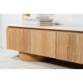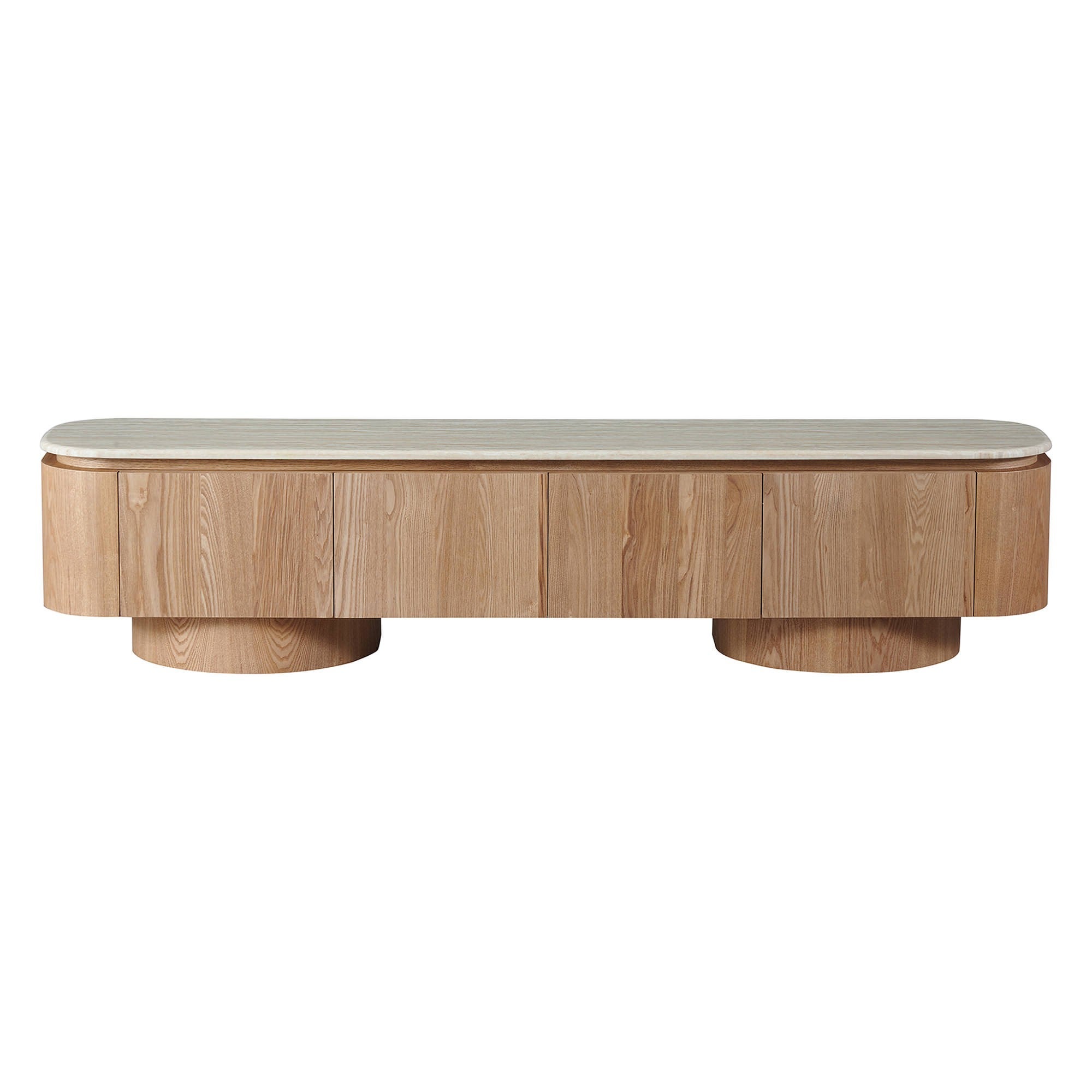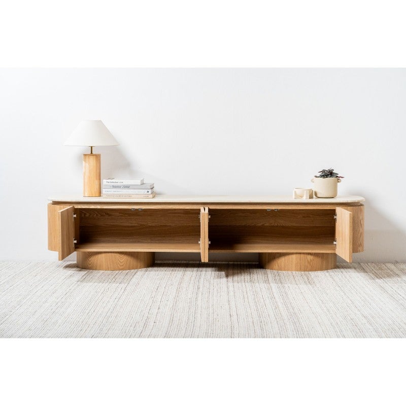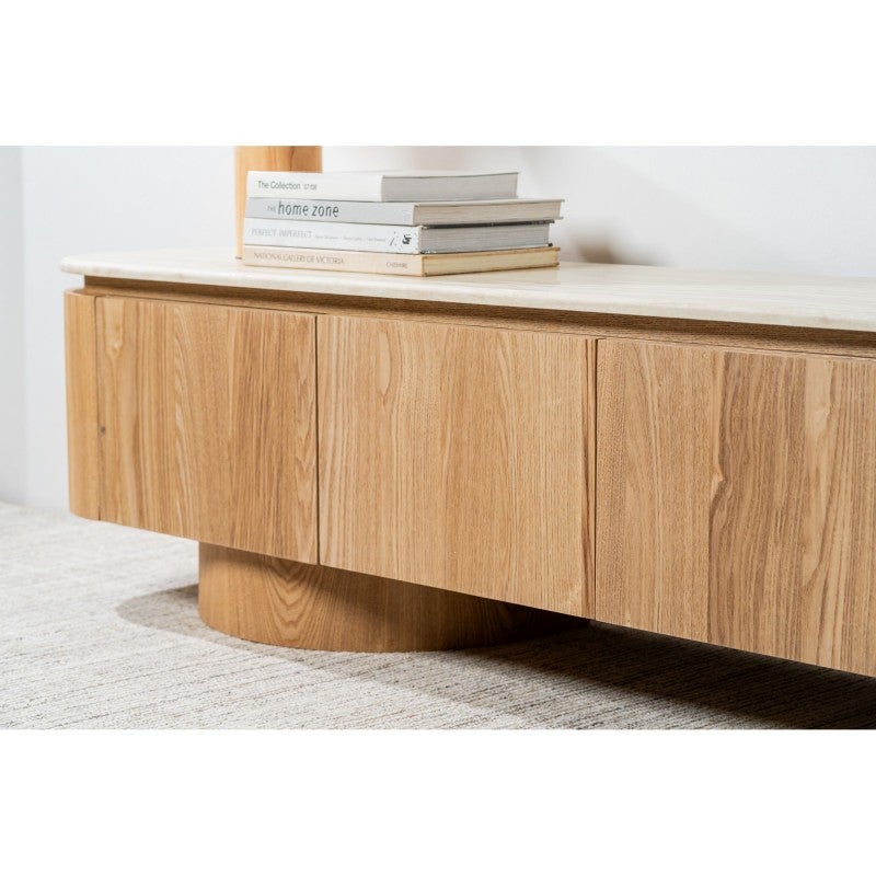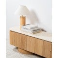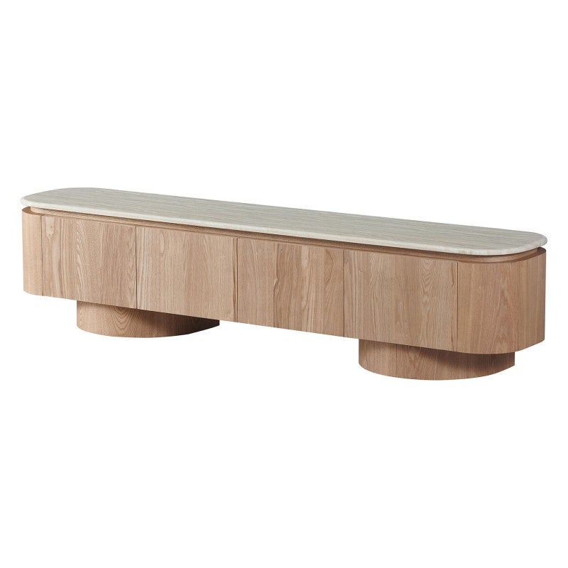 The Haverin range blends organic textures with modern design, creating a collection that feels both timeless and contemporary. Each piece is topped with matte white travertine artificial marble, offering a sophisticated stone look with everyday durability. The body and frame are crafted from ash veneer MDF in a natural finish, adding warmth and elegance. With its soft curves and versatile forms, the Haverin range brings harmony and understated luxury to living and dining interiors.