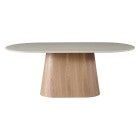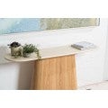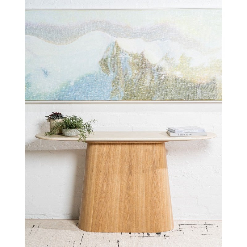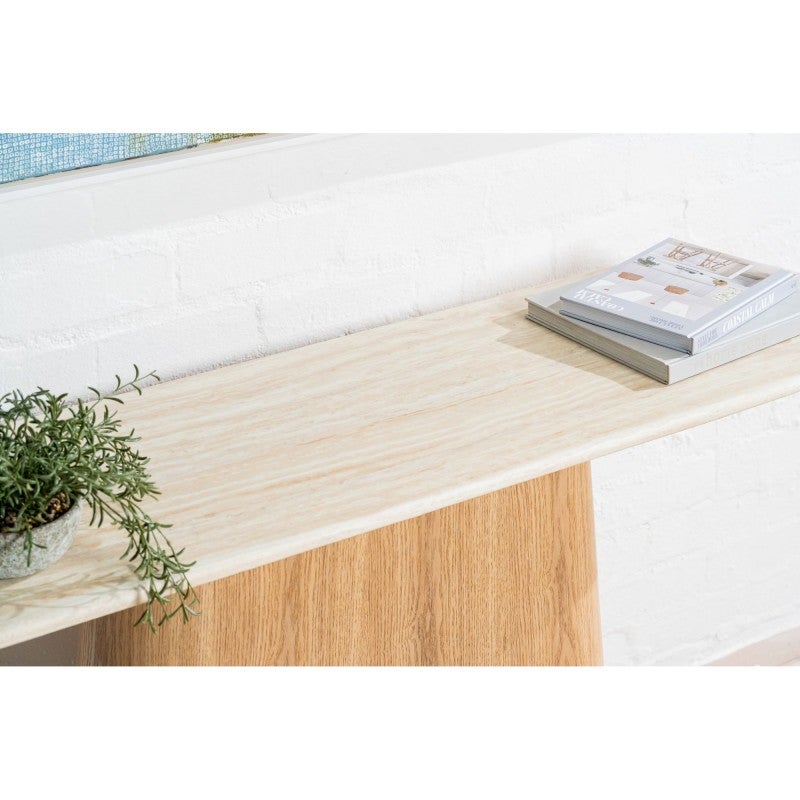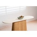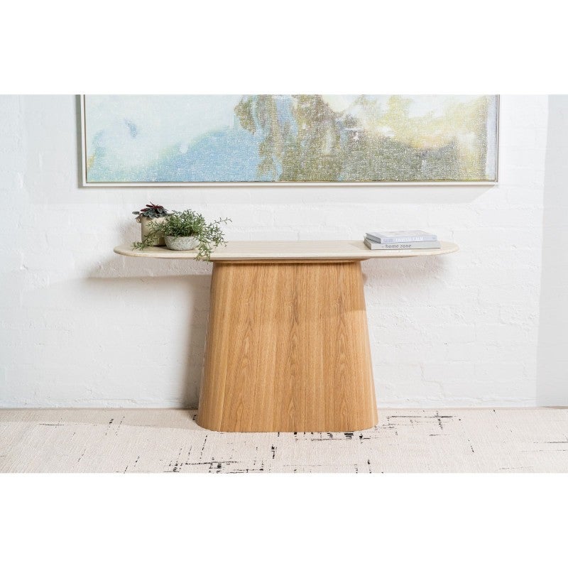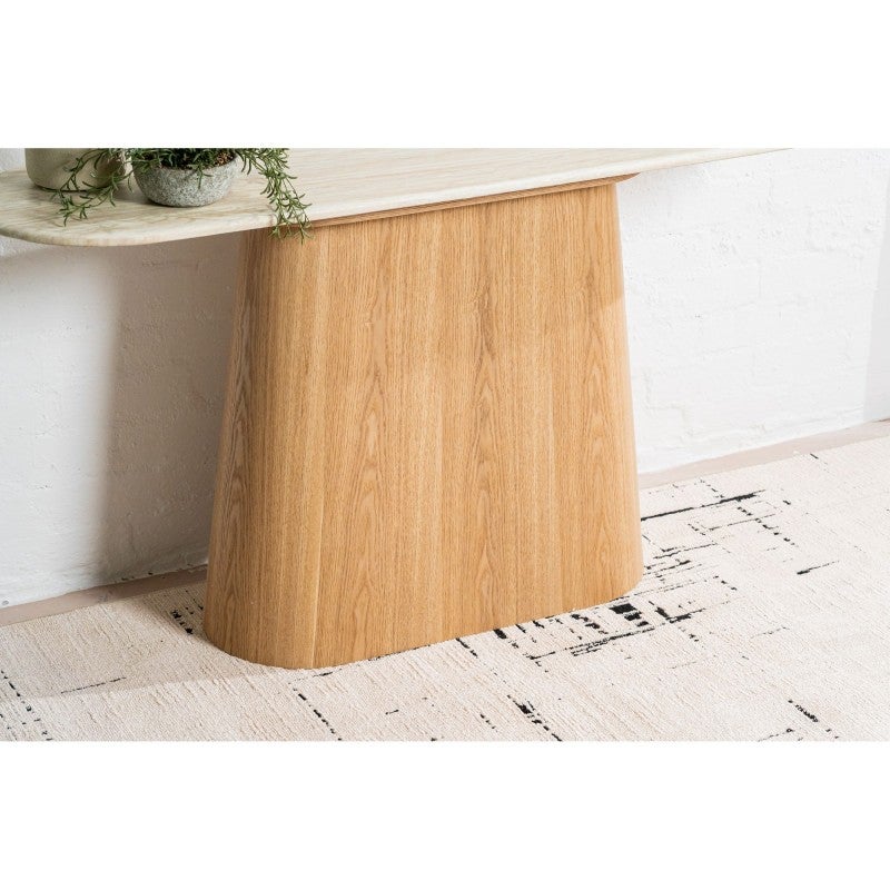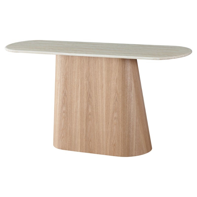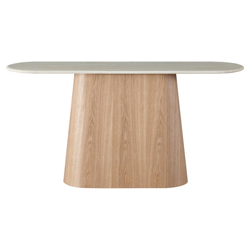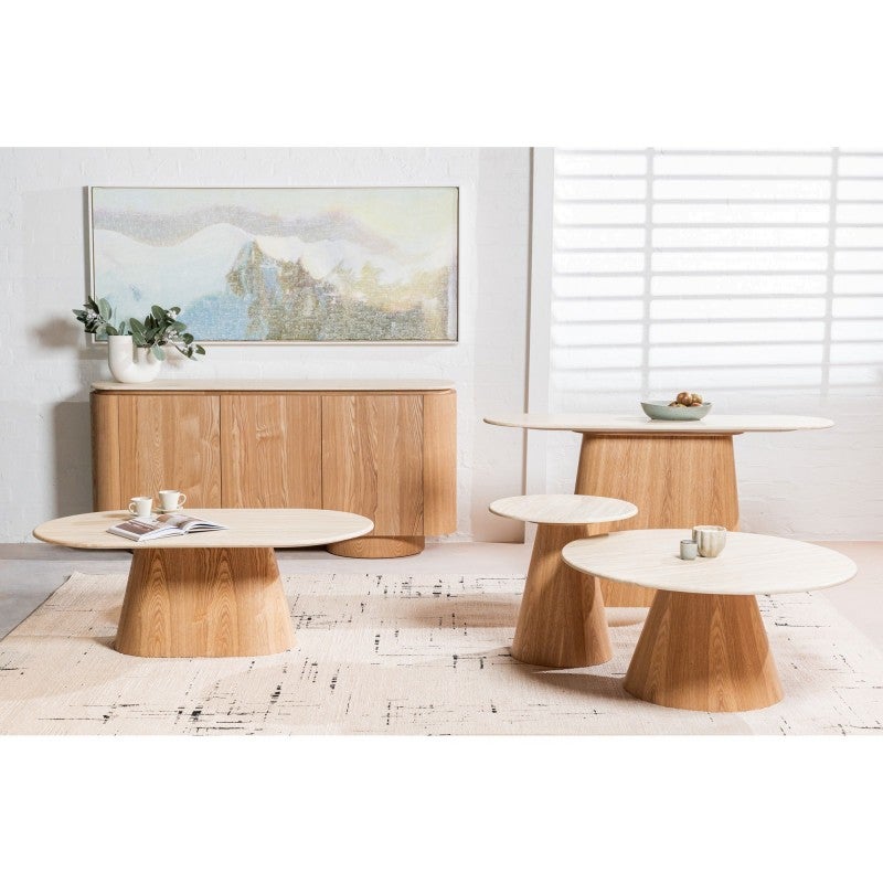 The Haverin range blends organic textures with modern design, creating a collection that feels both timeless and contemporary. Each piece is topped with matte white travertine artificial marble, offering a sophisticated stone look with everyday durability. The body and frame are crafted from ash veneer MDF in a natural finish, adding warmth and elegance. With its soft curves and versatile forms, the Haverin range brings harmony and understated luxury to living and dining interiors.
