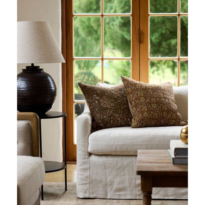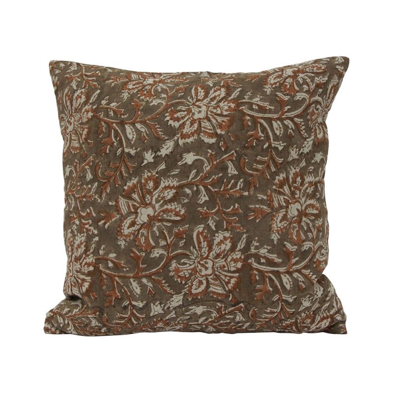 Heritage inspired floral print cushion cover in soft linen. Perfect for bringing a touch of tradition and rich earthy tones into the home.
