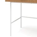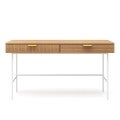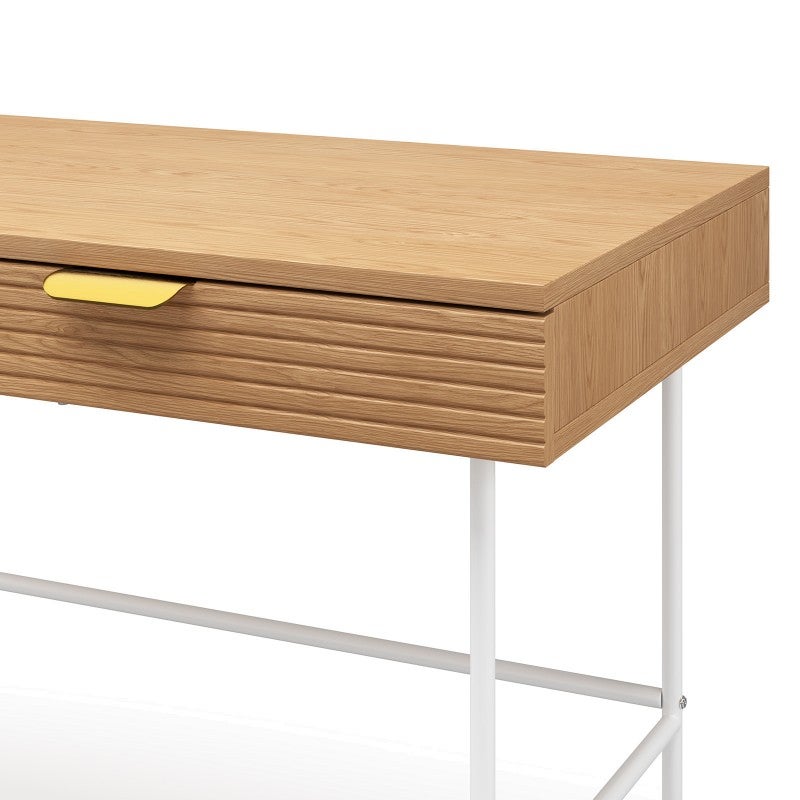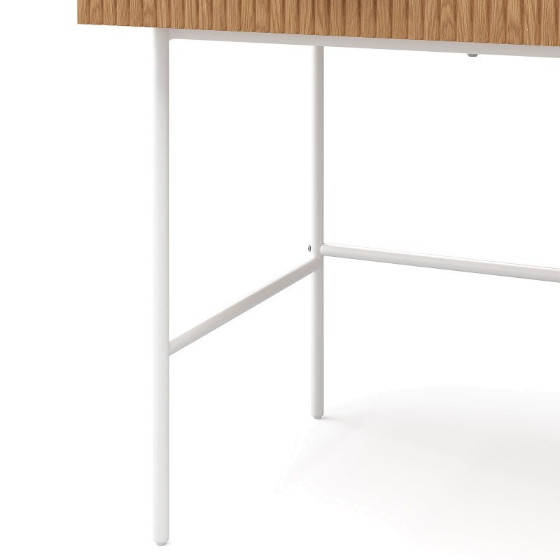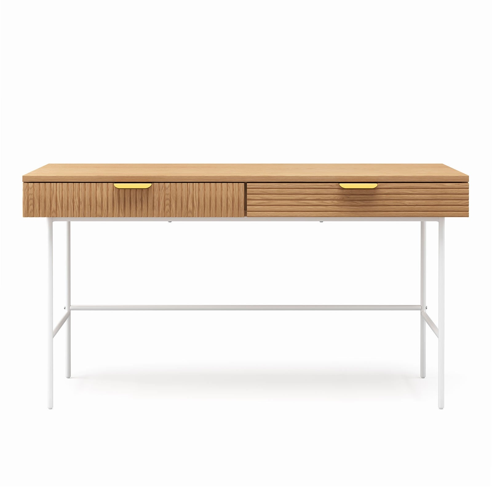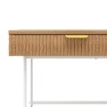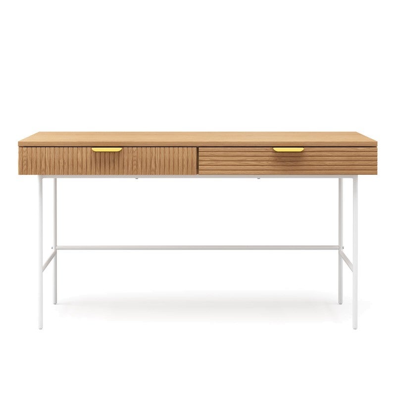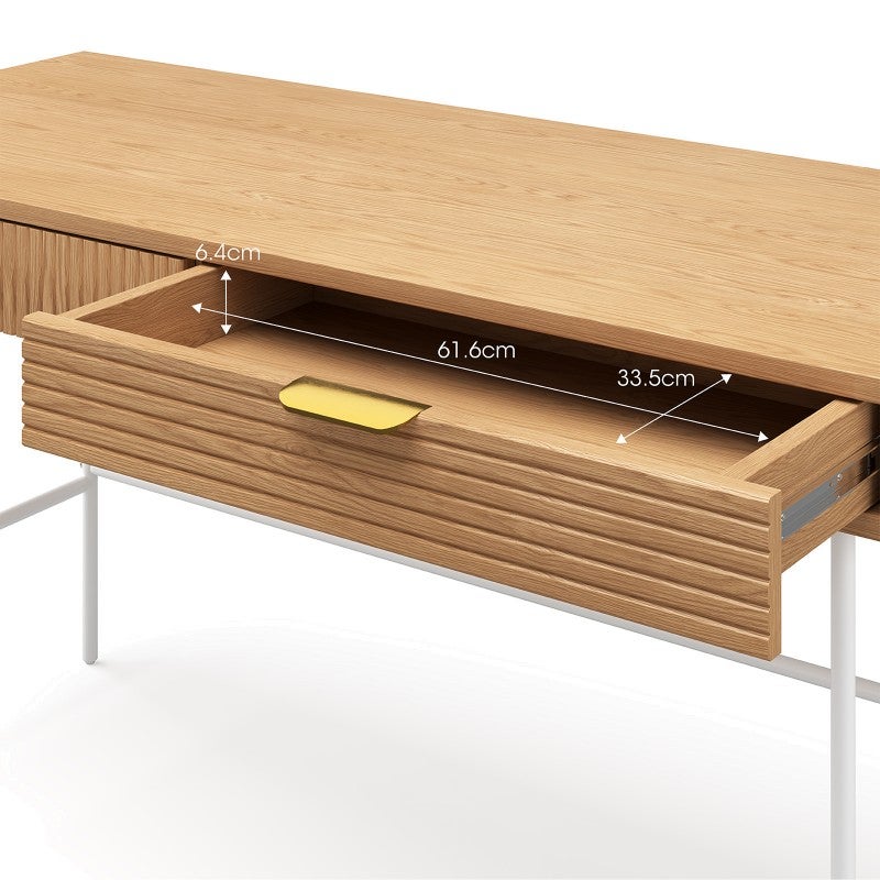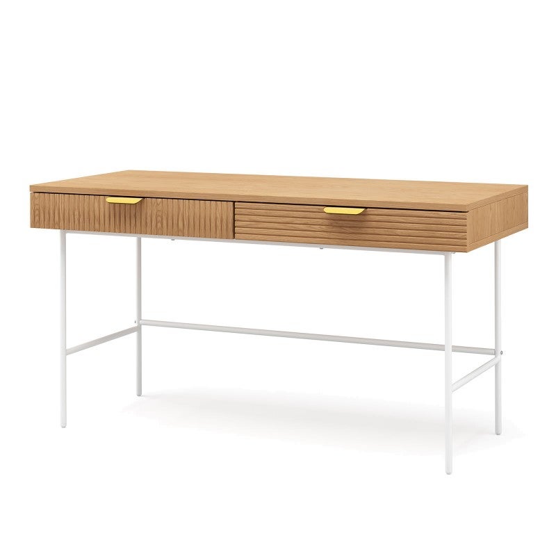Take a seat at the Kina Ripple Slatted Desk. This modern piece adds a unique edge to any home, study or office work space. Horizontal and vertical ripples in the slatted drawer adds an interesting contrast and attracts the eye, whilst the gold handles and organic American oak wood textures complete its contemporary appeal. From its matte white slender frame to its spacious 140cm tabletop, the Kina Desk boasts ample space for a laptop, keyboard or the whole serious WFH setup. With its refined minimalist look, this piece checks all the aesthetic boxes all while boosting your productivity.