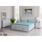 White washed, brushed Mountain Ash range with a distinctive paneled "checker-board" headboard. A contemporary coastal design with generous proportions. Full extension metal runners. Features metal handles with an antiqued finish. Storage drawers in beds to maximize storage for your room. Solid wood slat system with central support legs.