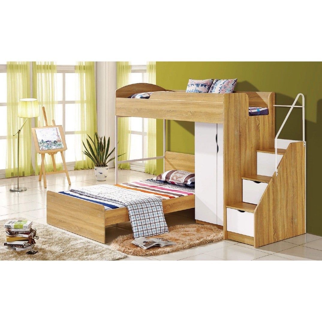 What sets the Lynrik apart is its unique configuration, with the upper and lower beds positioned differently to create an interesting layout that maximizes space. A two-door wardrobe is cleverly built into the design, providing ample storage for clothing, toys, or accessories, making it ideal for a growing child's room or a guest space.