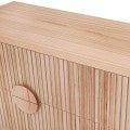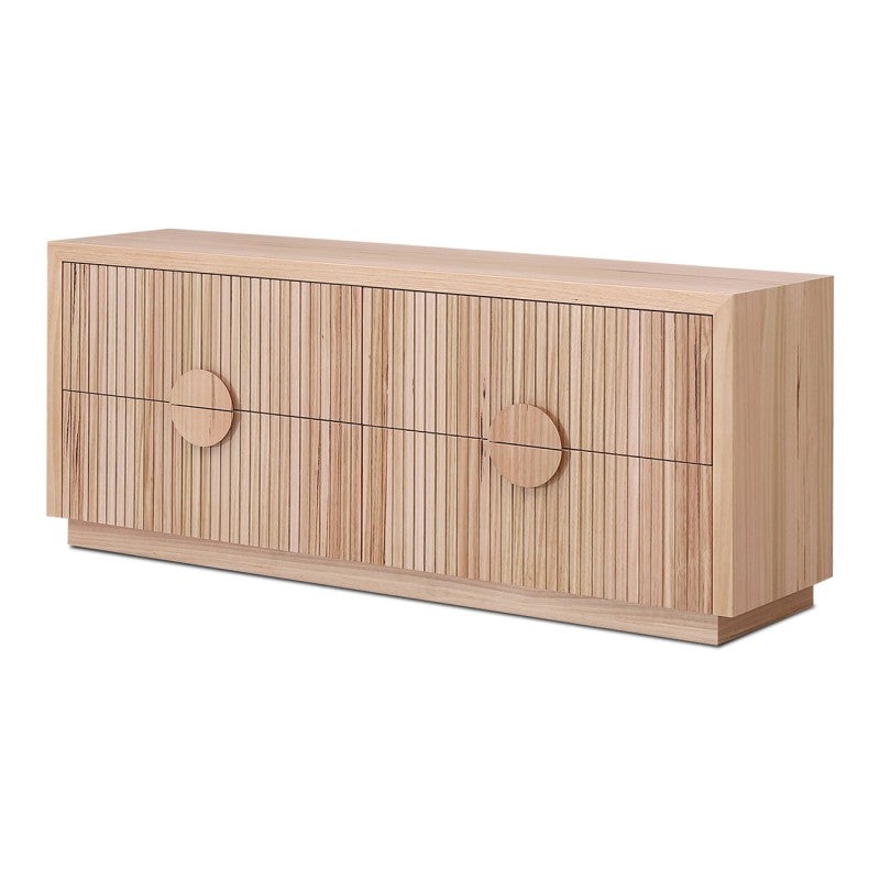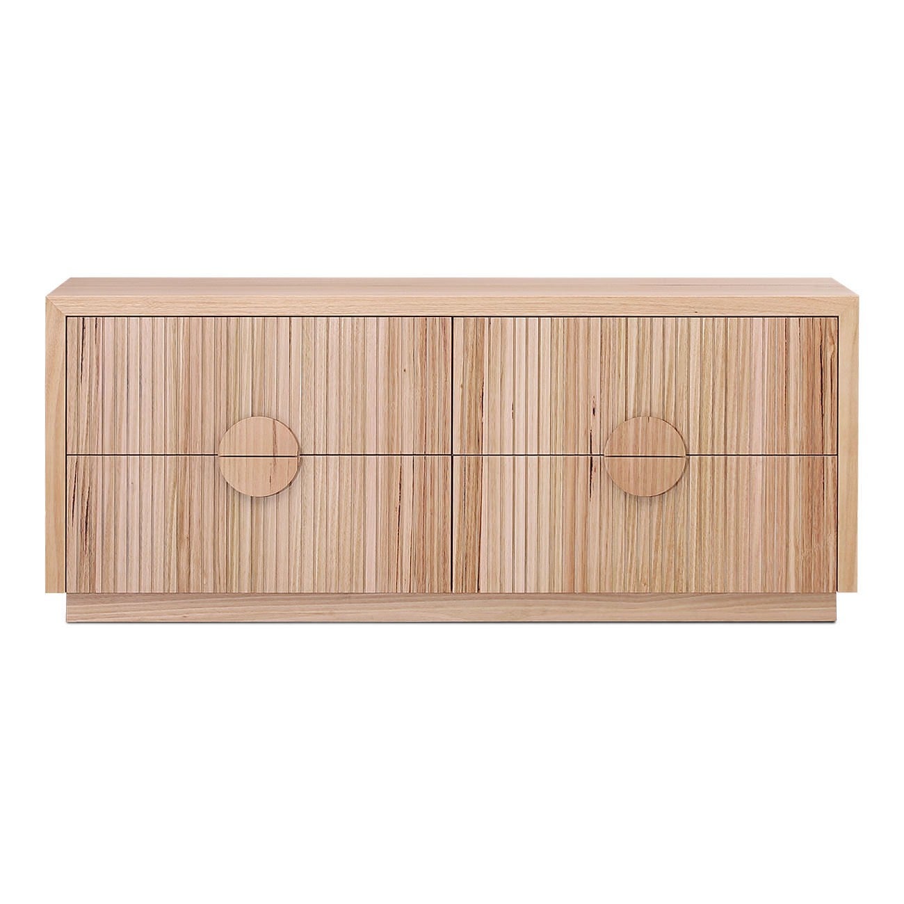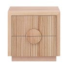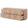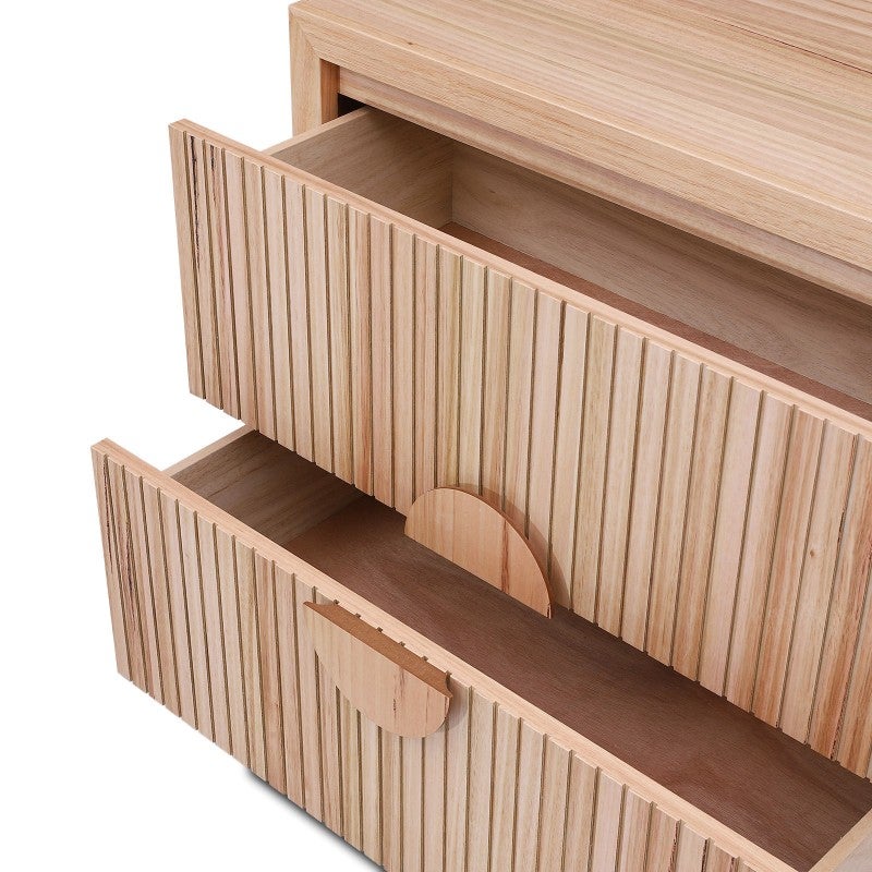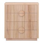 A spacious chest of drawers and a low-profile dresser with matching handles provide ample storage for clothing and essentials. The natural wood grain is emphasized by the light finish, creating a warm and inviting atmosphere in the bedroom. The minimalist design, paired with the subtle elegance of the veneer, makes this set a versatile choice for modern living.