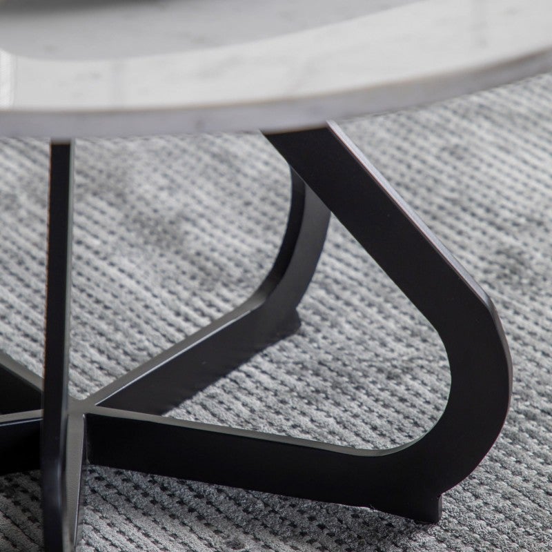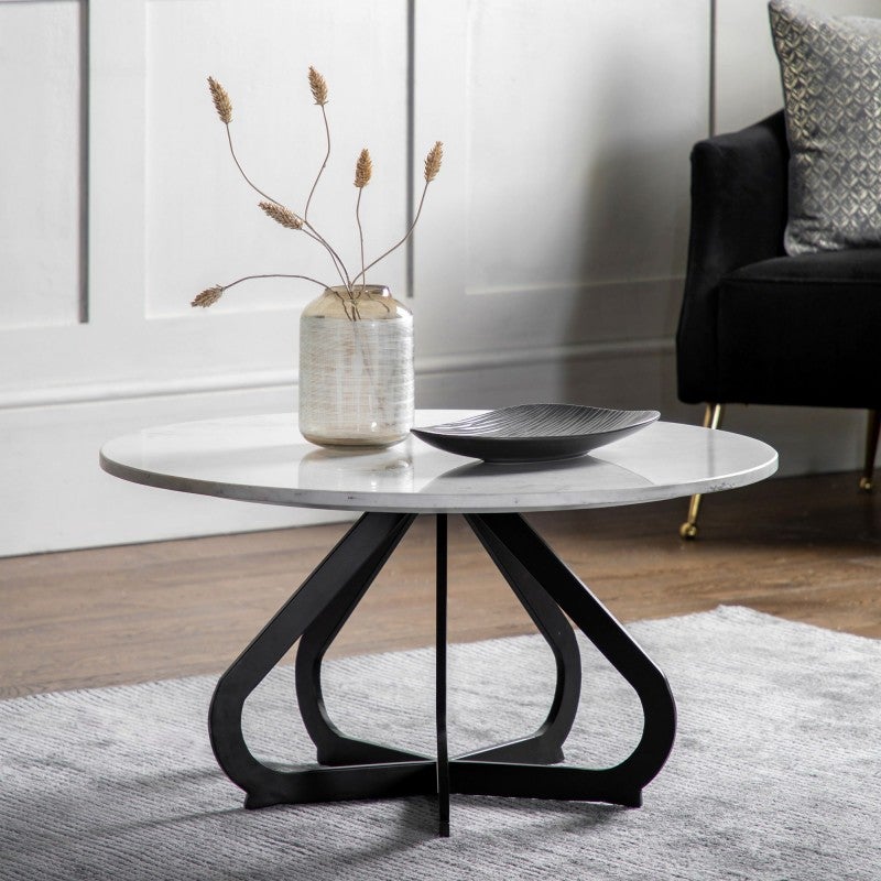 Add a touch of glamour to a room with this stunning coffee table. The stylish, contemporary design features a white marble top paired with an eye-catching metal base with a matt black finish.