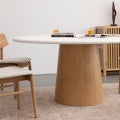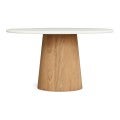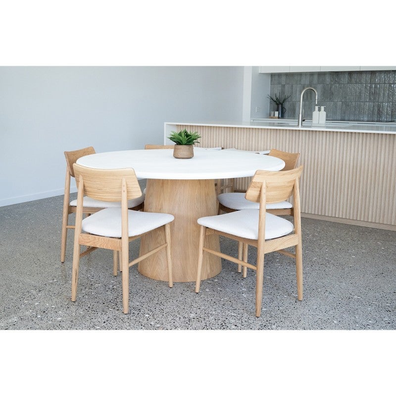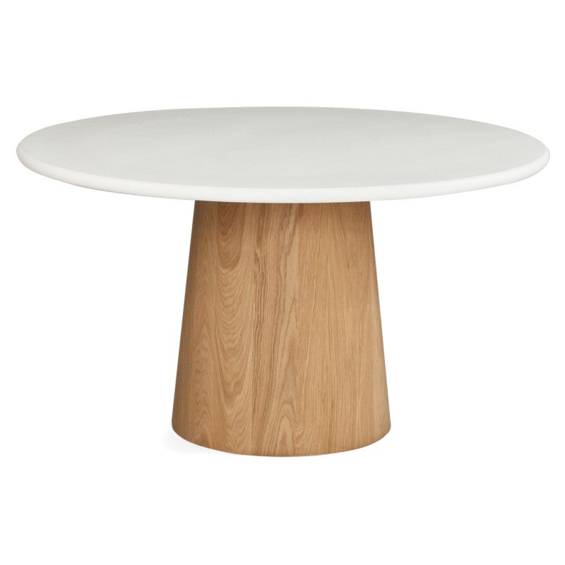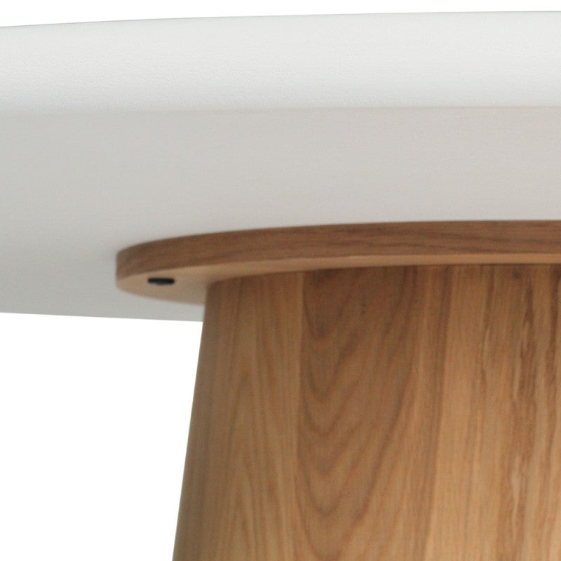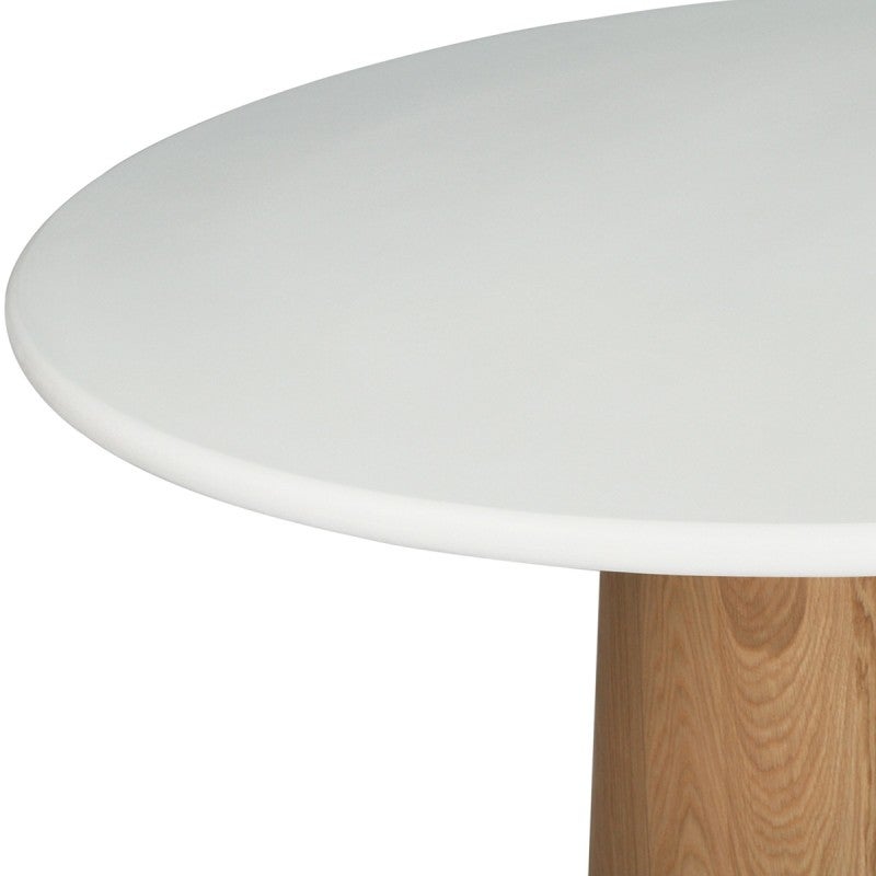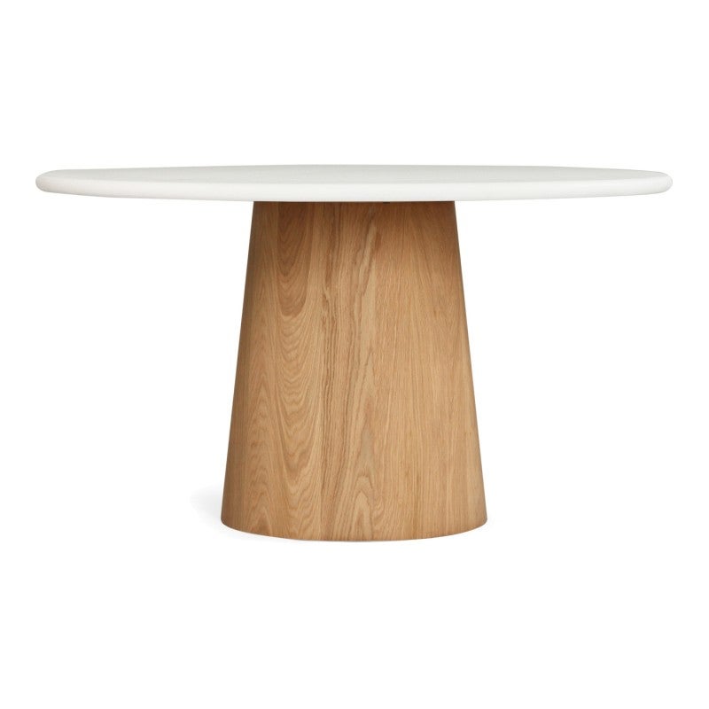 The Muse Dining Table features a unique white micro cement table top on top of a tapered conical European Oak Veneer base. The perfect table to gather around for a home cooked meal. With its smooth, polished appearance, a microcement table effortlessly elevates the ambiance of any room. Microcement is a modern, decorative solution, rising in popularity for its sleek and sophisticated finish. It's a polymer-modified cement-based coating that adds a touch of luxury and contemporary design to our furniture pieces. Tables are often subjected to daily wear and tear. A microcement surface offers a robust finish that can withstand the rigors of daily use.
