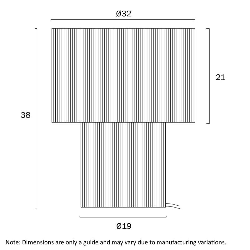 - 32cm Dia x 38cm H; Shade: 32cm Dia x 21cm H; Base: 19cm Dia