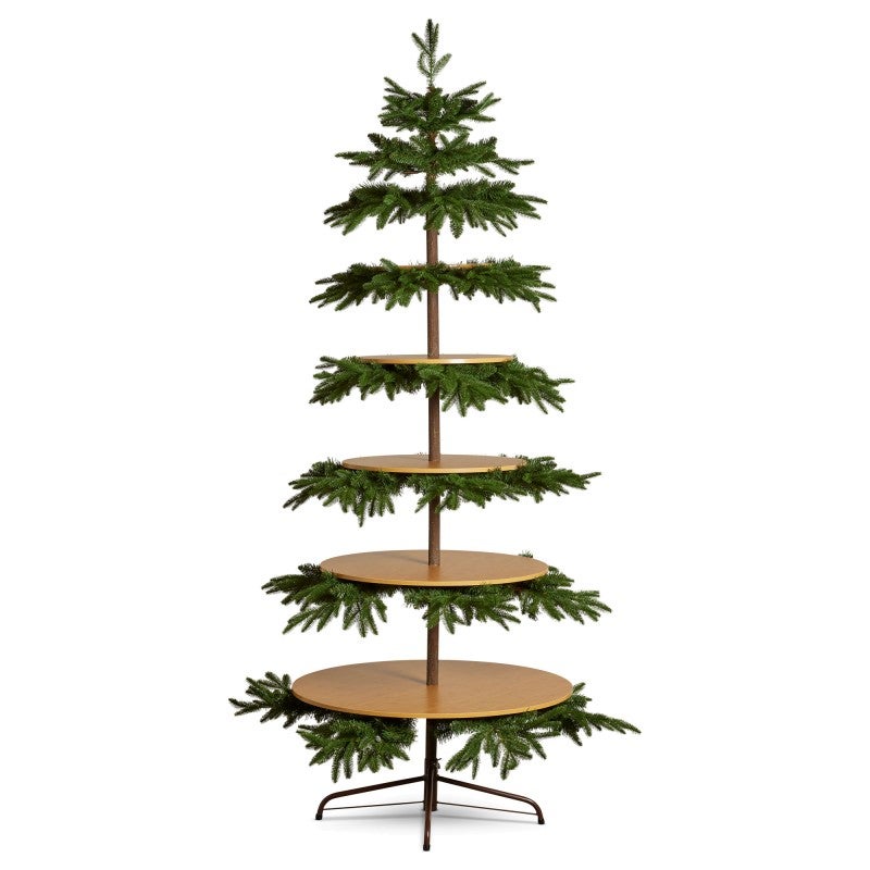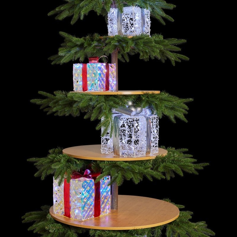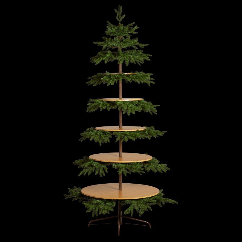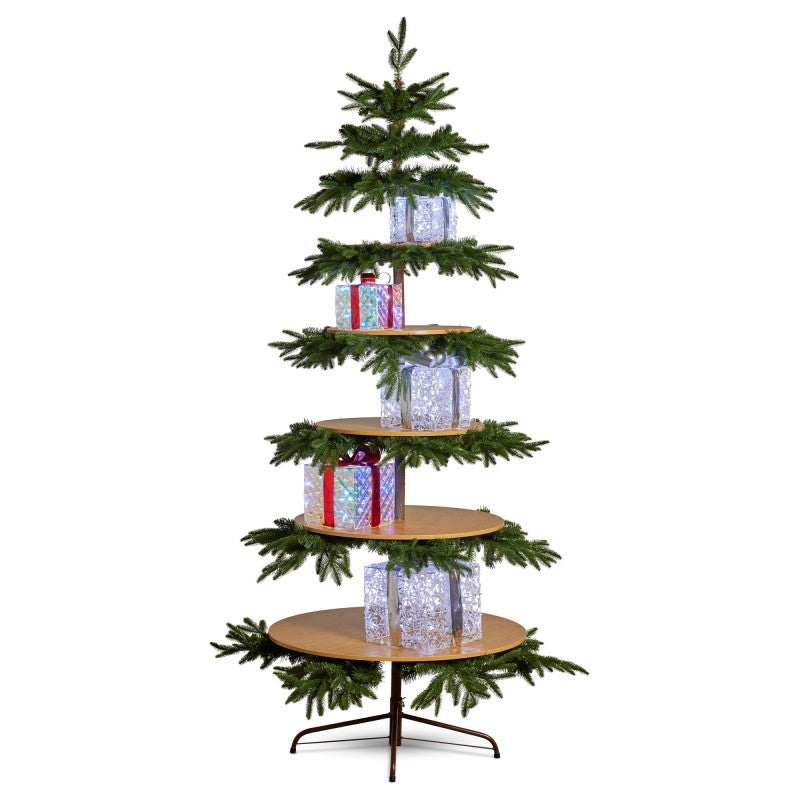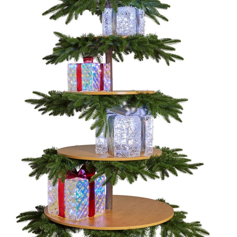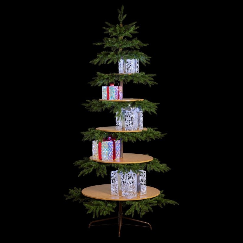 If you need an amazing, festive display piece to showcase your products, you cant go past this Christmas platform tree. It stands at 7.5 feet tall and is both practical and a great feature. It comes with 5 sturdy bamboo shelves, built in foliage which is perfect for hanging tree decorations and it's easy to assemble. Make your products really stand out with this beautiful and functional piece that offers the perfect backdrop for both hanging and table top items. Max recommended load for base shelf is 3.7kg, 1329 tips on hinged branches.