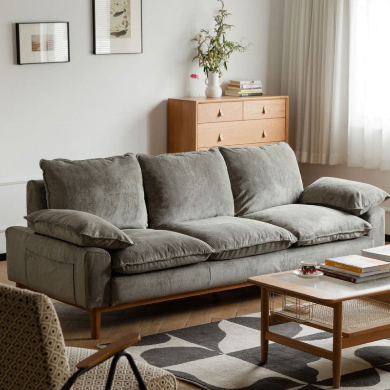 - Corduroy Fabric, Feather, Polypropylene Fibre, Latex, High Resilience Foam, S Spring, Webbing, Russian Larch Timber, American Cherrywood Timber Feet