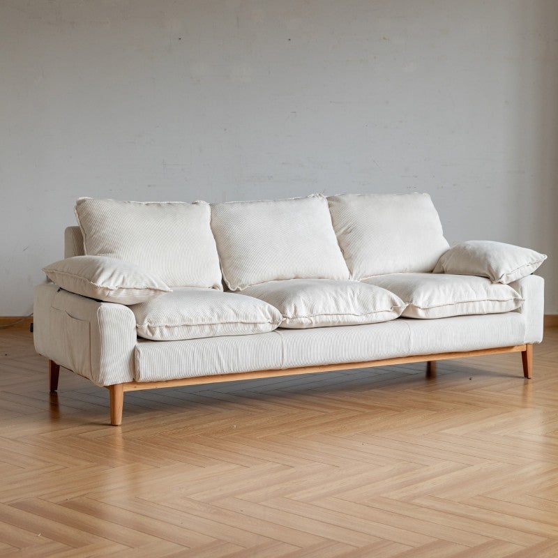 - Corduroy Fabric, Feather, Polypropylene Fibre, Latex, High Resilience Foam, S Spring, Webbing, Russian Larch Timber, American Cherrywood Timber Feet