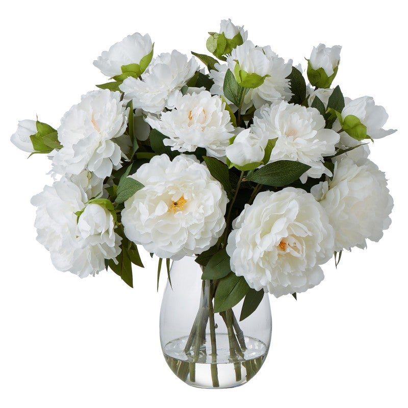 - The arrangement is elevated further by the Claire glass vase with a wide oval silhouette that enhances the graceful look of the peonies.