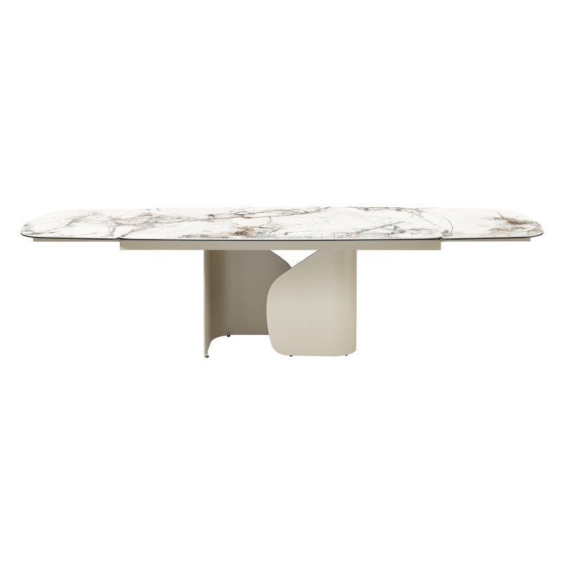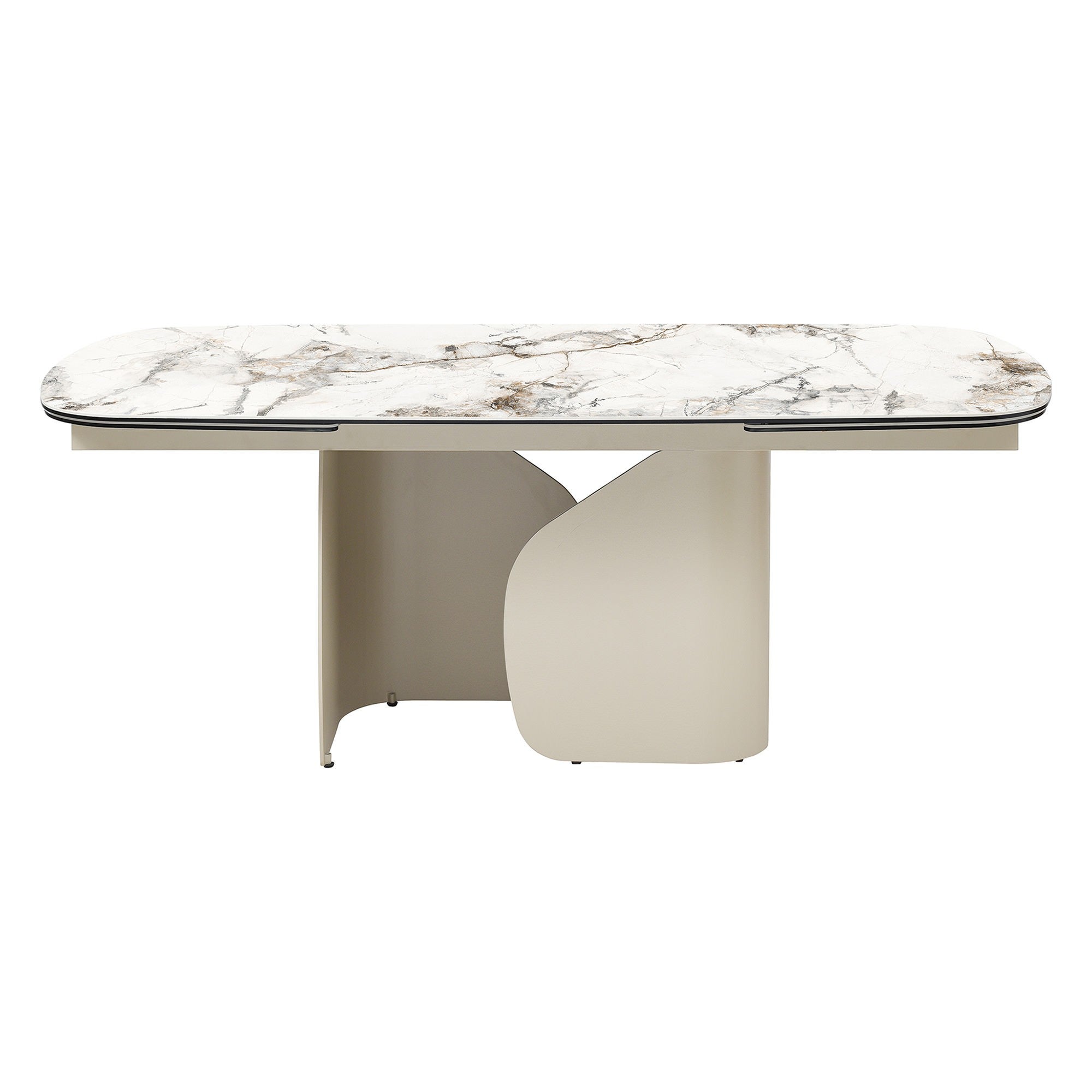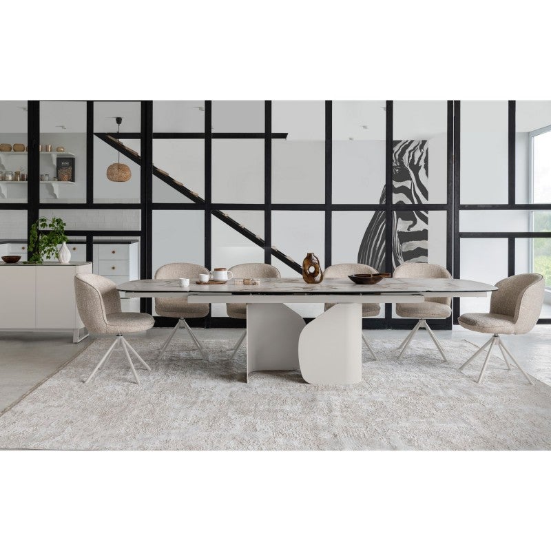 The Rosvina Extension Dining Table makes a bold contemporary statement with its sculptural silhouette and refined materials. Its matte Milan white marble ceramic top, layered on tempered glass, is scratch resistant and effortlessly elegant. Supported by an ivory powder-coated metal frame, the table extends seamlessly from 200 cm to 300 cm with side extensions, offering both functionality and sophistication for modern dining spaces.
