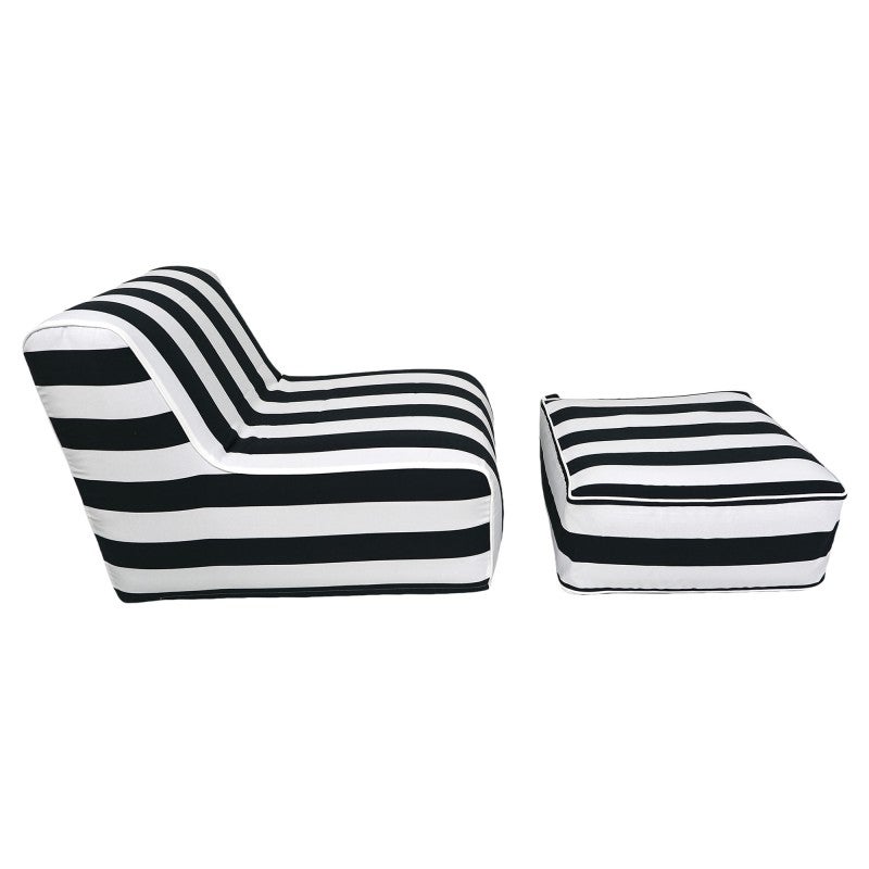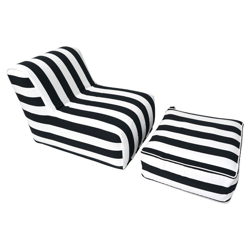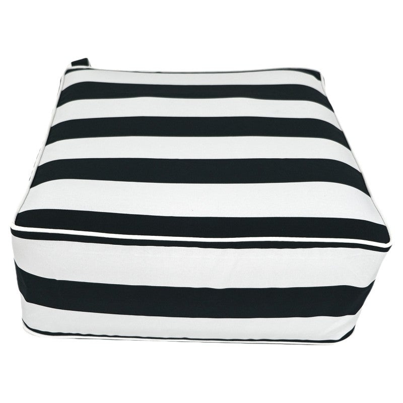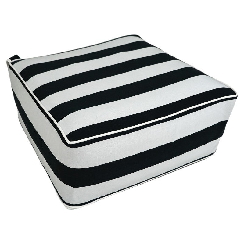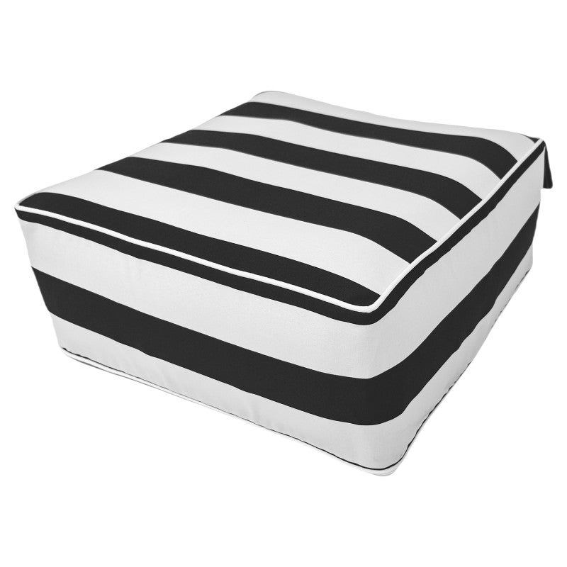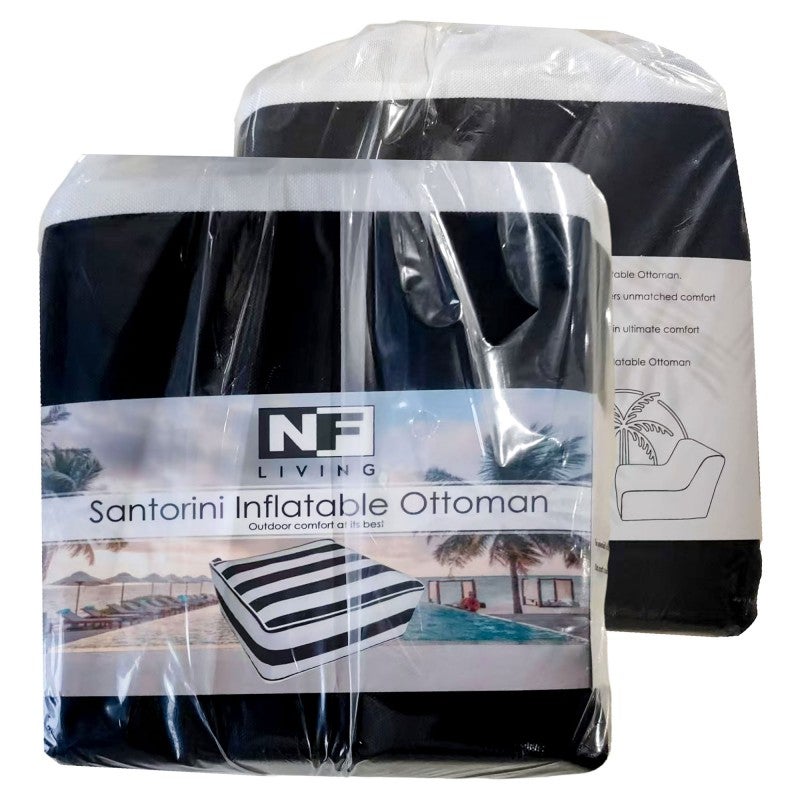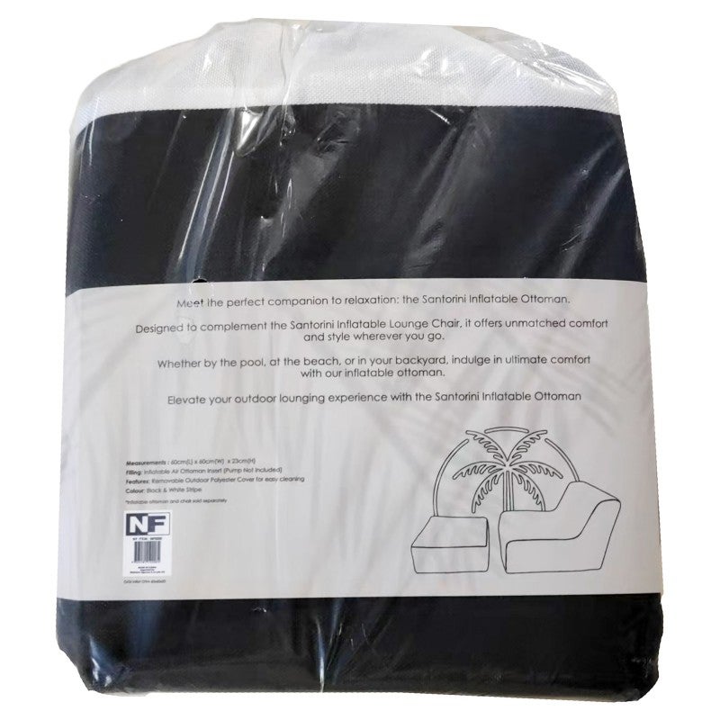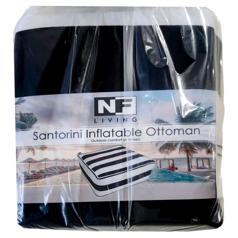 Enhance your outdoor relaxation with the Santorini Inflatable Ottoman by NF Living. This versatile, black stripes ottoman pairs perfectly with the Santorini Lounge Chair or stands alone as a comfortable footrest or extra seating. Its inflatable design makes it easy to set up, deflate, and store, making it ideal for poolside lounging, patios, or beach trips. The ottoman is covered in a durable, weather-resistant fabric with elegant white piping that adds a touch of style and sophistication to any outdoor space. Lightweight and portable, it’s the perfect accessory for creating a cozy and chic outdoor environment. Take comfort anywhere with this stylish inflatable ottoman, designed for ease and elegance. Dry Clean Only