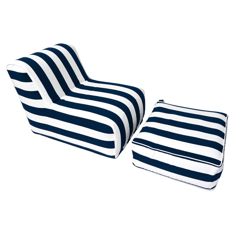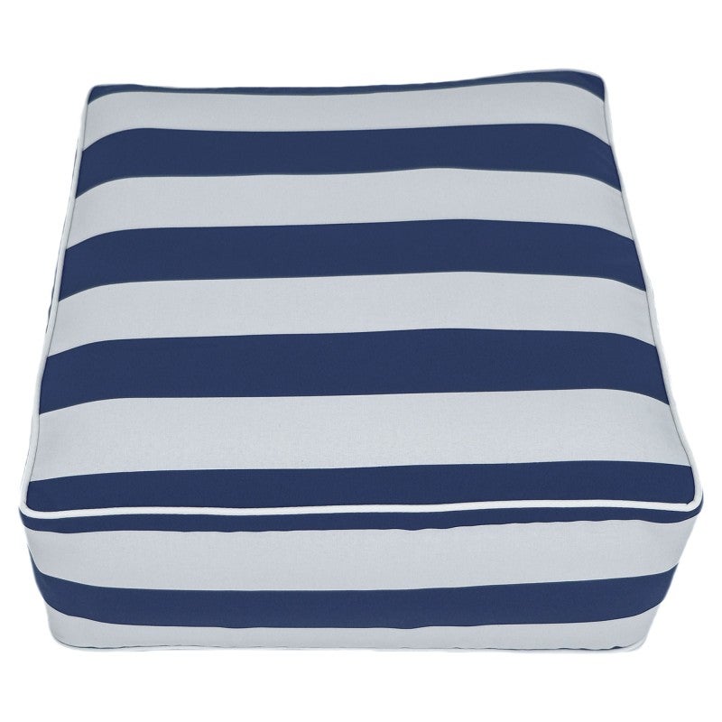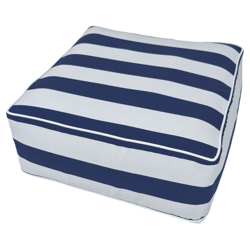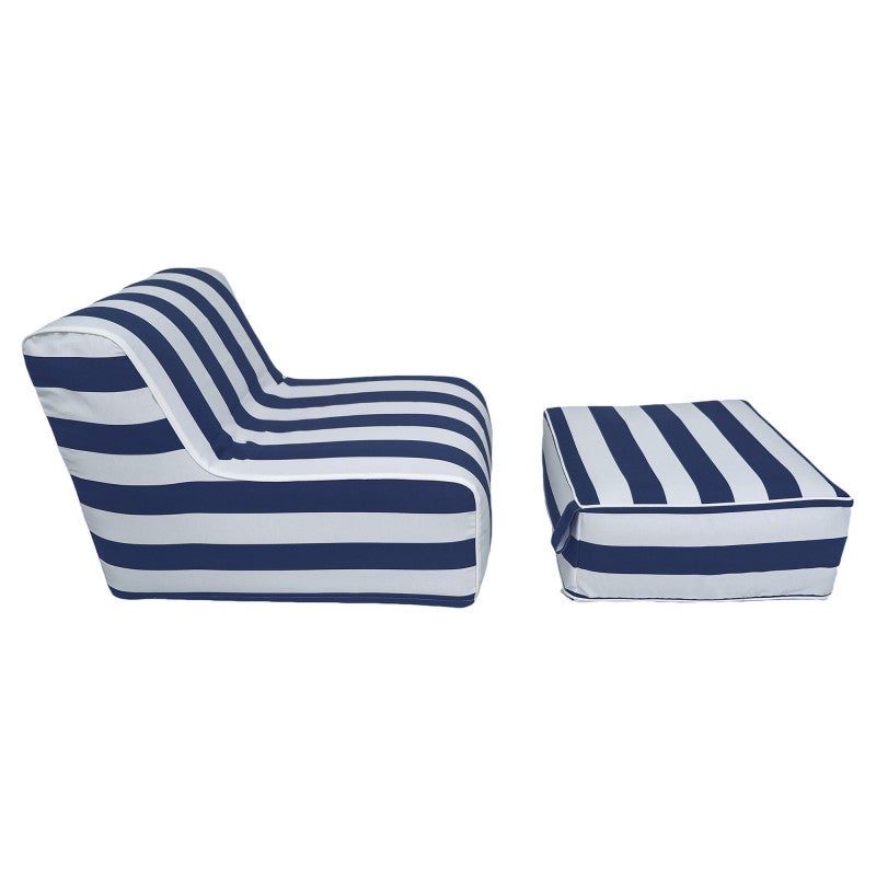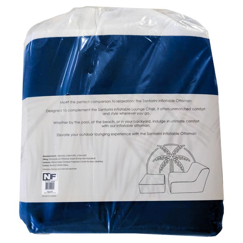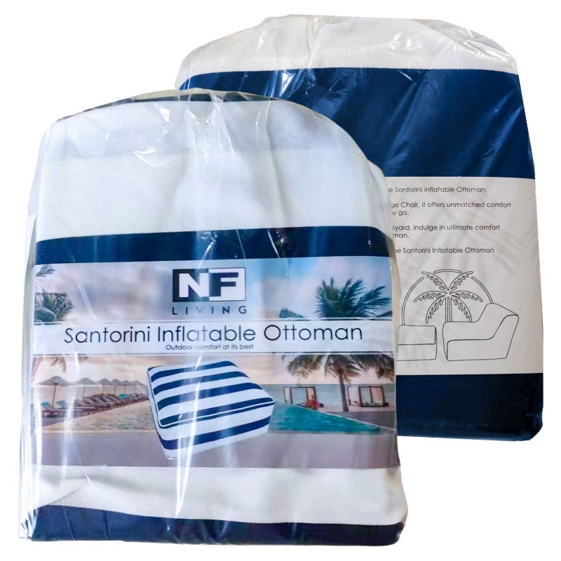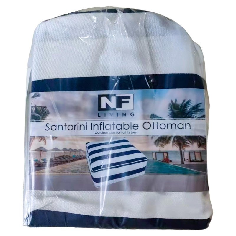Enhance your outdoor relaxation with the Santorini Inflatable Ottoman by NF Living. This versatile, navy blue stripes ottoman pairs perfectly with the Santorini Lounge Chair or stands alone as a comfortable footrest or extra seating. Its inflatable design makes it easy to set up, deflate, and store, making it ideal for poolside lounging, patios, or beach trips. The ottoman is covered in a durable, weather-resistant fabric with elegant white piping that adds a touch of style and sophistication to any outdoor space. Lightweight and portable, it’s the perfect accessory for creating a cozy and chic outdoor environment. Take comfort anywhere with this stylish inflatable ottoman, designed for ease and elegance. Dry Clean Only