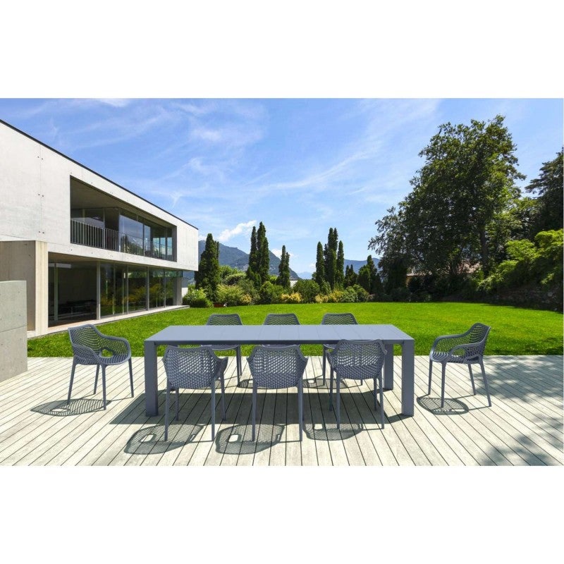 The set includes 1 Vegas table and 8 Air XL Armchairs. The table is made from high-quality polypropylene reinforced with fiber glass, which makes it highly durable and resistant to unraveling and rust. It is also UV resistant, which means that it will not fade or crack over time. One of the best features of this dining set is that the table is extendable from 2600 to 3000mm. This means that it can be adjusted to accommodate more guests and provide ample space for everyone.