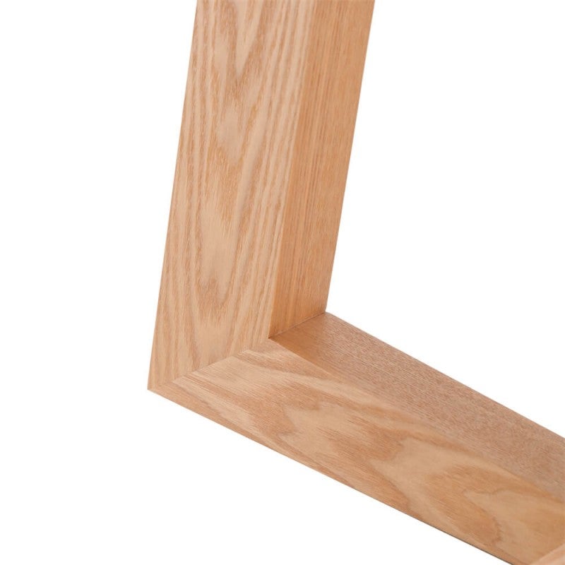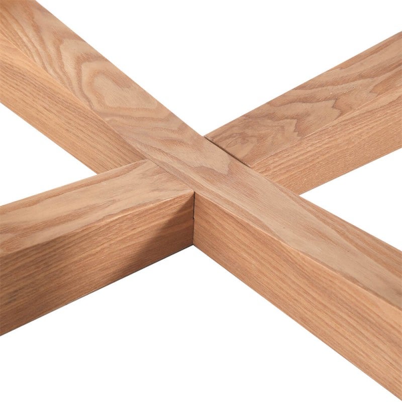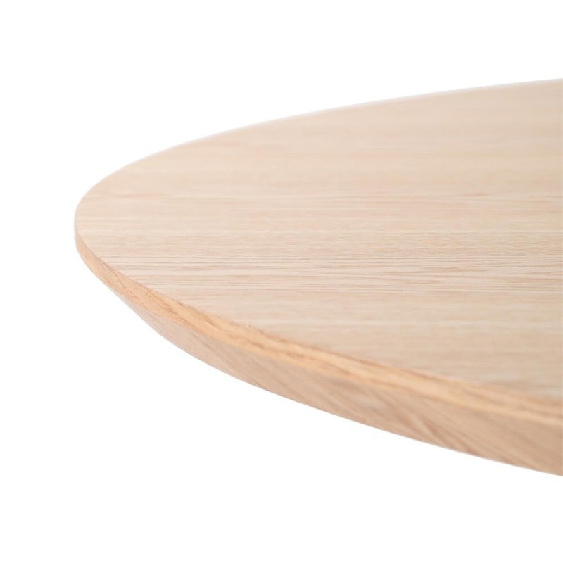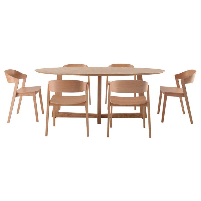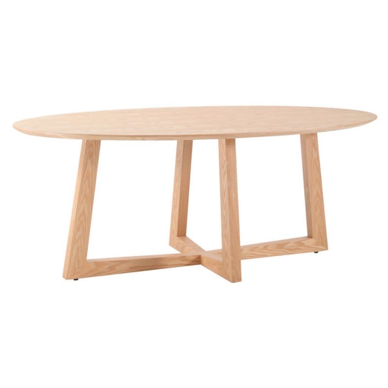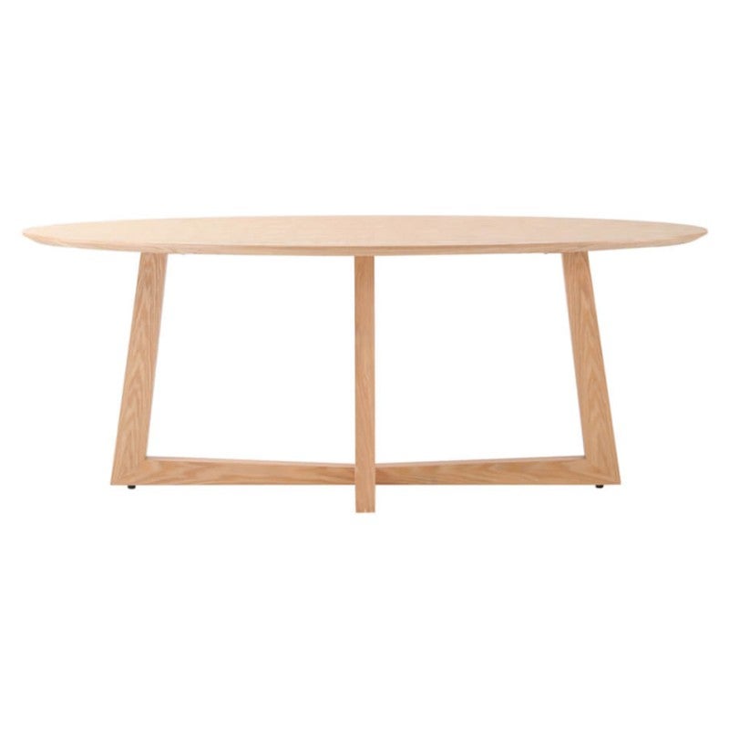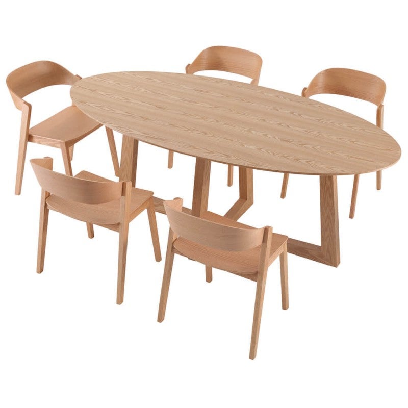Provides classic minimalism to your dining space for a sleek and refined finish. The veneer of the tabletop and the solid ash wood frame are in a blonde timber hue and feature a gorgeous natural grain, which makes it easy to introduce to any setting. Constructed from an MDF top, and with a solid wood frame and legs, this Sloan oval timber dining table adds natural touch to your classic dining room interior and perfectly suited for your everyday dining use, large dinner parties or even as a stylish conference table. The frame of this dining table has a bold angular construction which adds dimension whilst also providing enough space for dining chairs to tuck under.