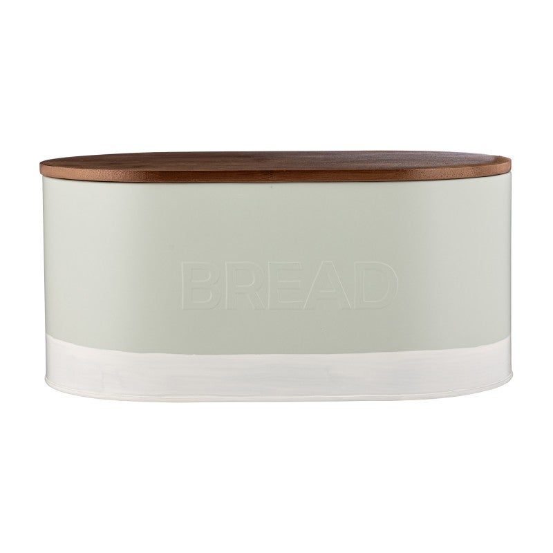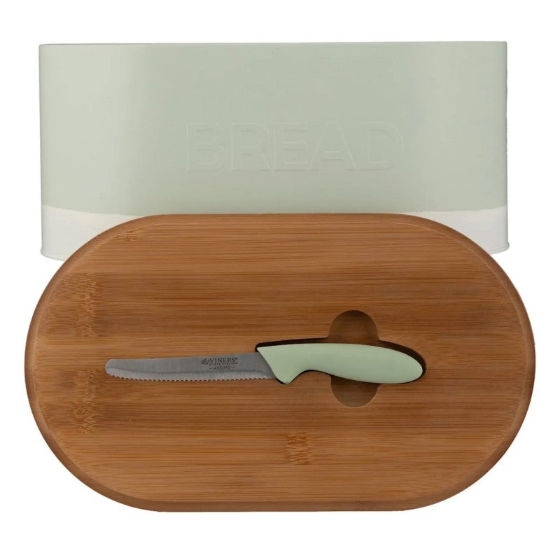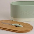 Typhoon Oben Bread Storage Bin with a bamboo lid that doubles as a cutting board, also comes with a serrated bread knife stored conveniently under the lid itself. Made from durable carbon steel which is easy to clean and maintain, while an airtight silicone seal keeps bread fresher for longer. Features a delightful two toned finish and an embossed label to identify what's inside. BPA-free, Set includes: 1 x bread bin with lid and 1 x bread knife