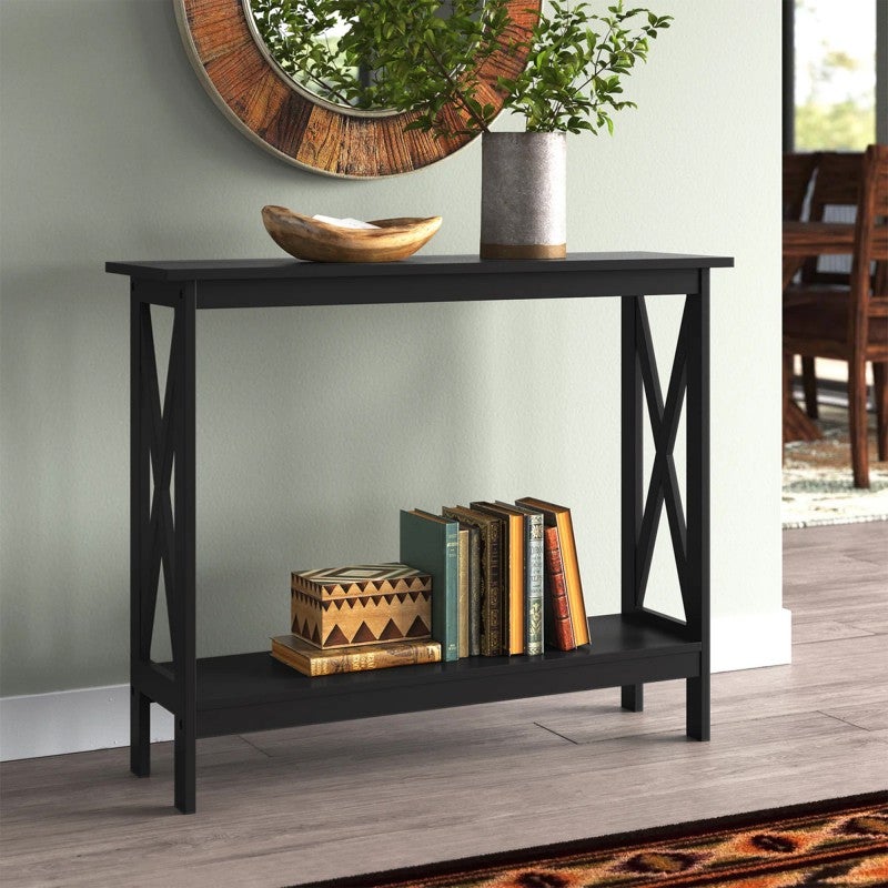 - A modern farmhouse sofa table is a charming addition with a relaxed and inviting ambiance