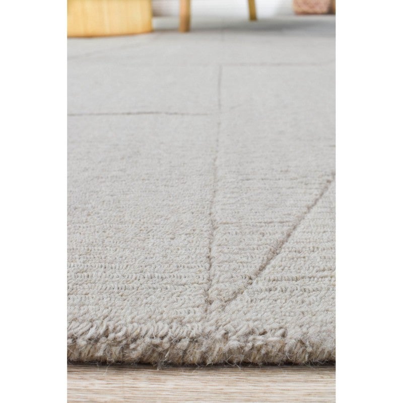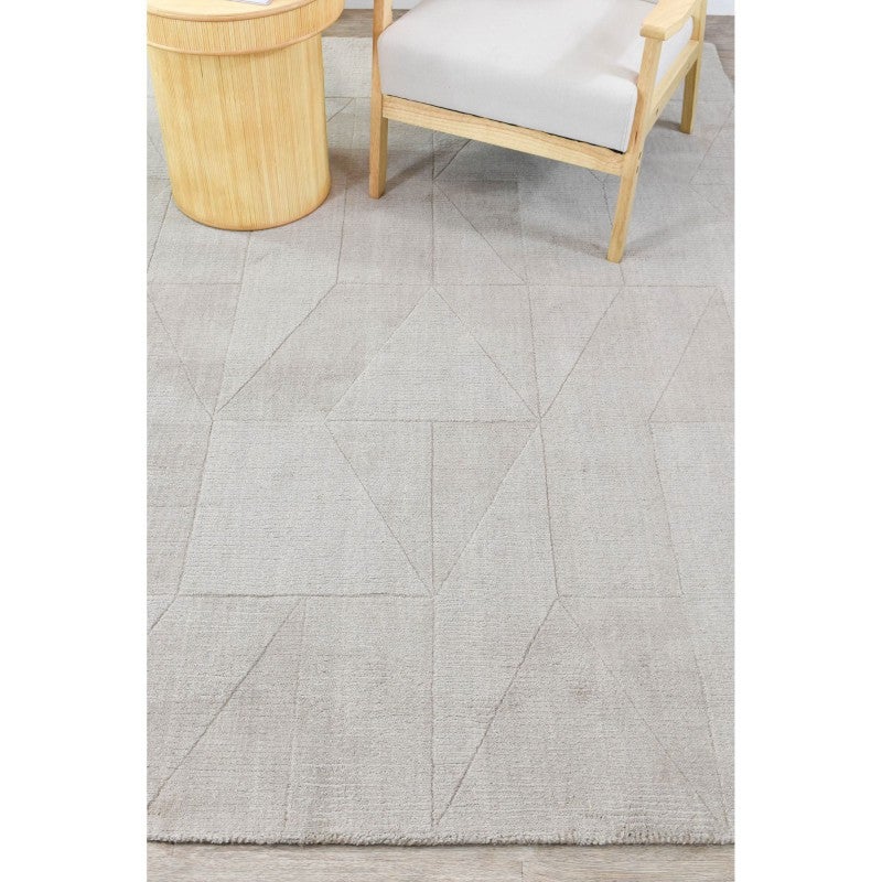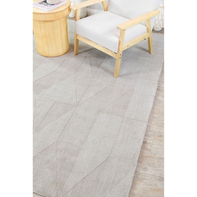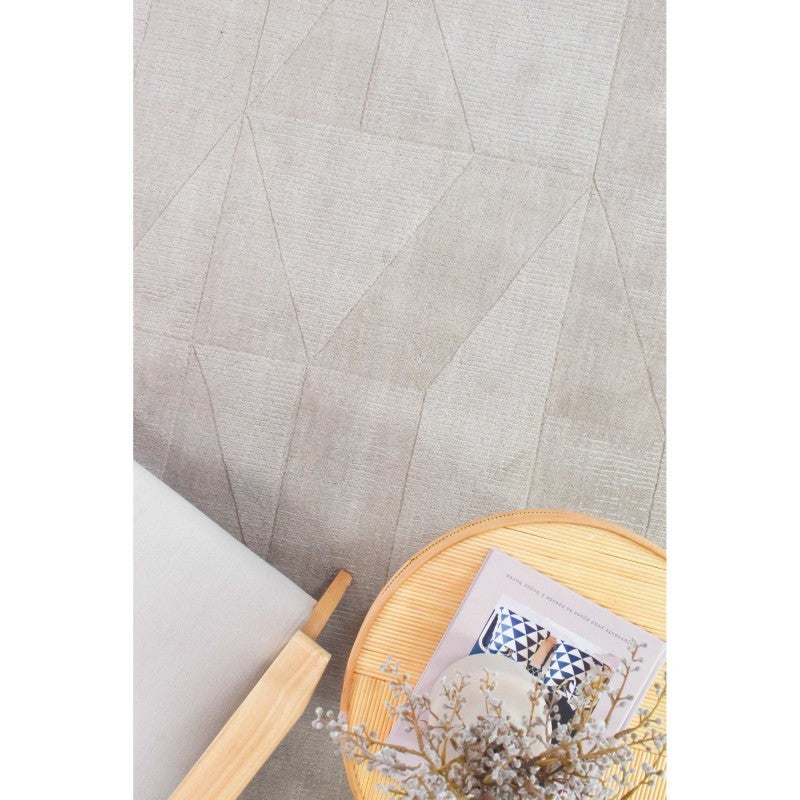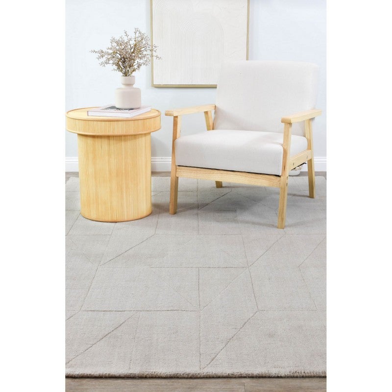 This rug features a striking triangular design with a subtle knitted texture, adding depth and character to any space. Its neutral latte tones provide warmth and versatility, making it an ideal choice for those looking to create a cozy atmosphere. Crafted from a premium wool blend, this rug offers an exceptionally soft feel underfoot, combining style, comfort, and artisanal craftsmanship.